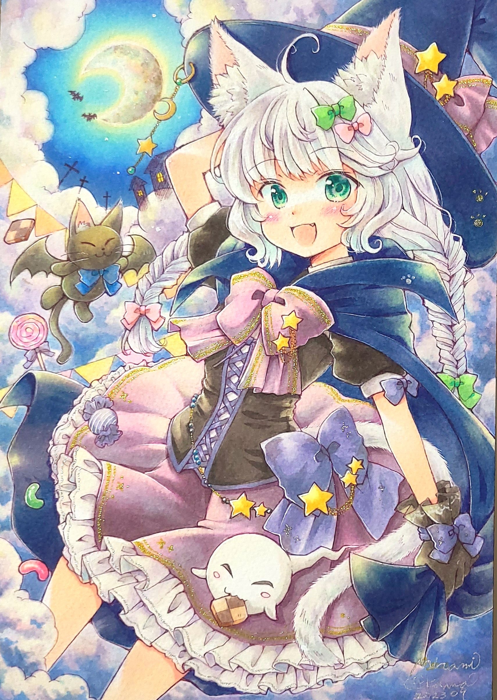 1girl above_clouds absurdres animal_ears artist_name bat_(animal) black_cat black_gloves blue_bow blue_cloak blue_hat bow bowtie braid candy cat cat_ears cat_girl cat_tail cloak cloud commentary cookie cowboy_shot crescent_moon dress dress_bow fang floating flying_animal food frilled_dress frills ghost gloves green_eyes halloween halloween_costume hand_on_headwear hat highres holding_cloak lollipop long_hair looking_at_viewer marker_(medium) medium_dress minami_kawa moon night original outdoors puffy_short_sleeves puffy_sleeves purple_bow purple_bowtie purple_dress scan short_sleeves signature solo star_(symbol) tail traditional_media twin_braids twintails white_hair witch_hat