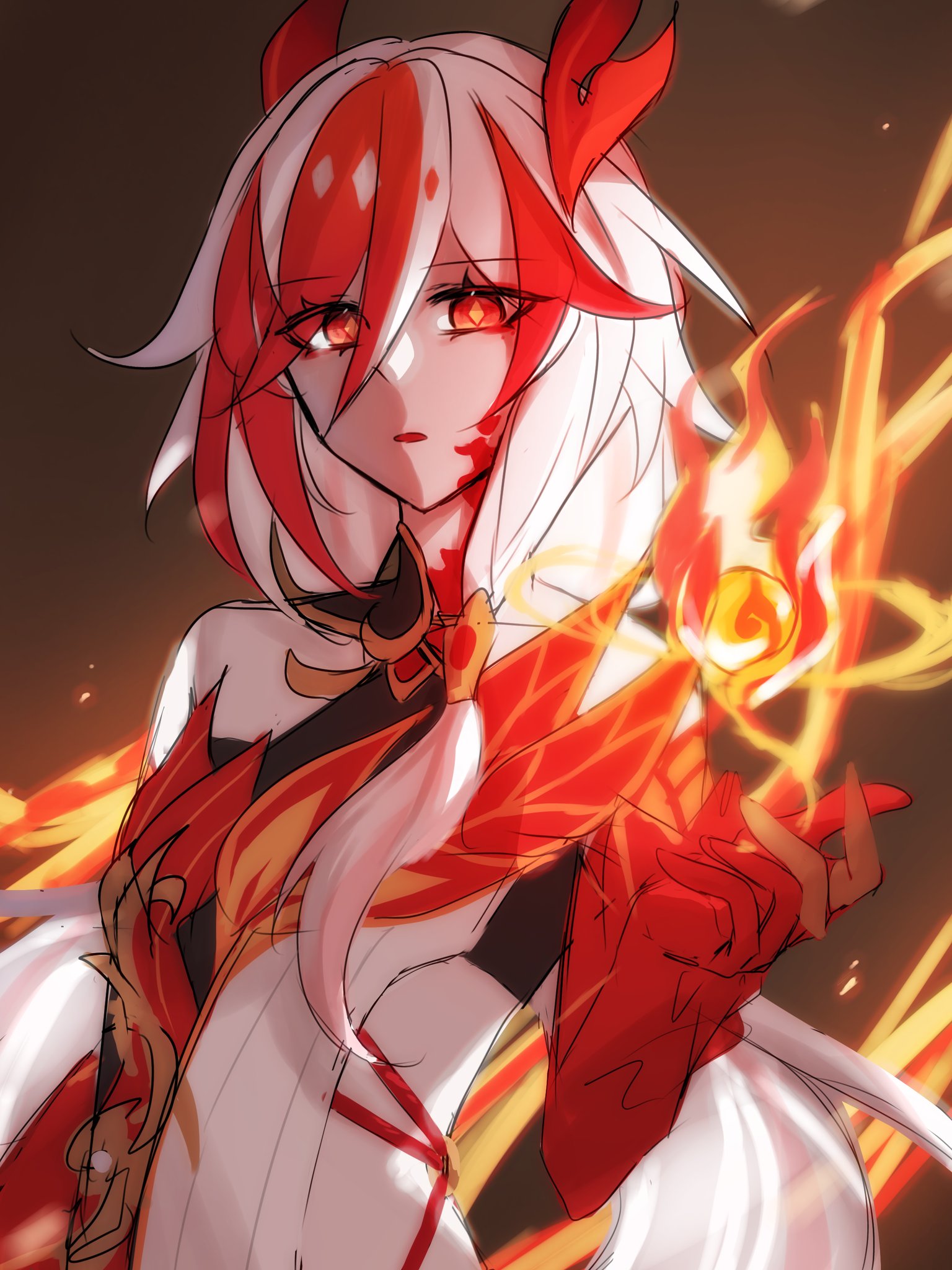 1girl bare_shoulders chinese_clothes commentary_request diamond-shaped_pupils diamond_(shape) fire fu_hua fu_hua_(garuda) gloves hair_between_eyes hand_up highres honkai_(series) honkai_impact_3rd korean_commentary long_hair looking_at_viewer mmaayyooccaatt multicolored_hair open_mouth red_eyes red_gloves red_hair red_scales solo streaked_hair symbol-shaped_pupils two-tone_hair upper_body very_long_hair white_hair yellow_pupils