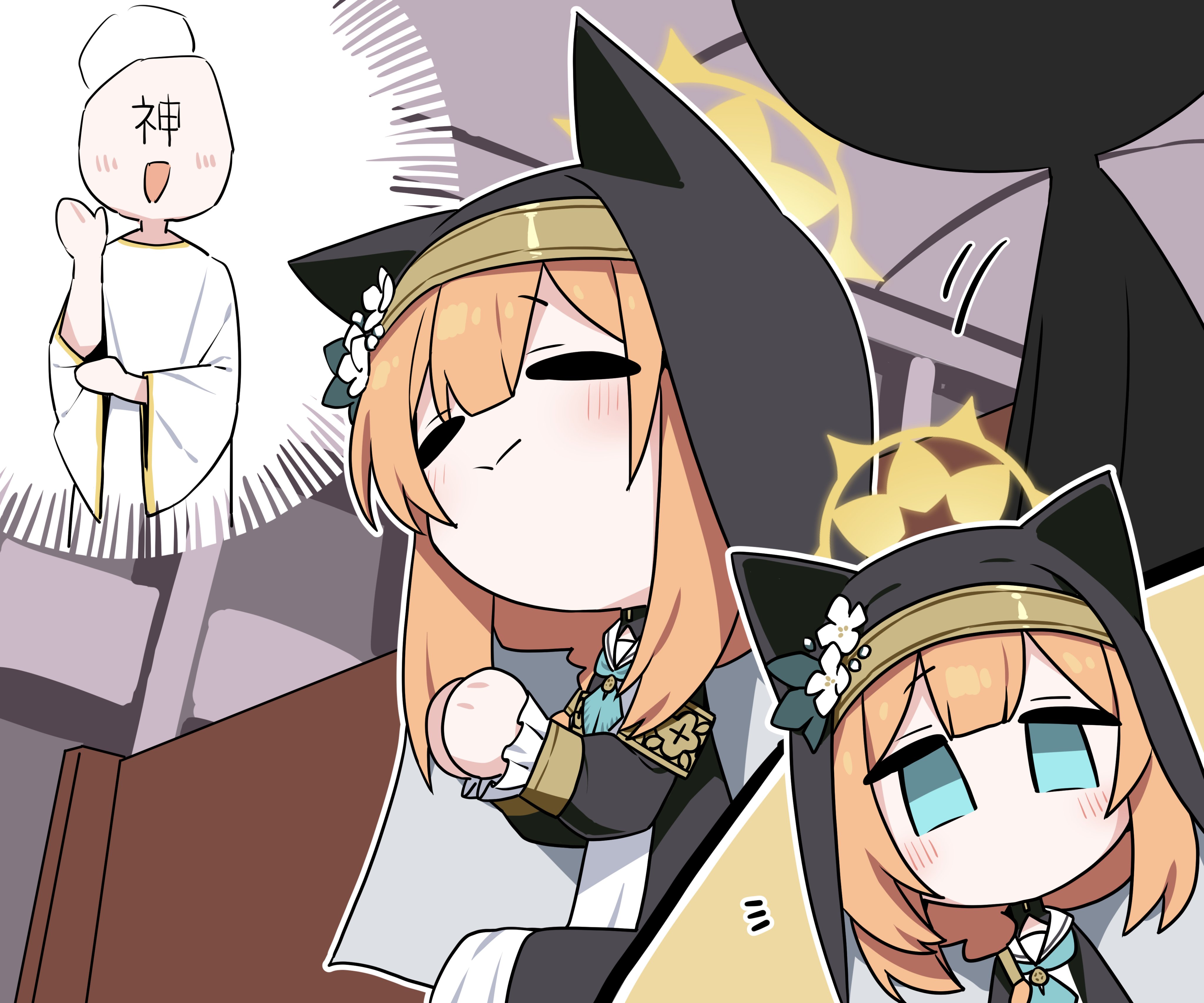 1boy 1girl 1other :> =_= absurdres animal_ear_headwear animal_ears armband b.t._(boob_tong) bad_link bad_twitter_link bench blue_archive blue_eyes blue_neckerchief cathedral church cloak closed_eyes coif dress fake_animal_ears flower frilled_sleeves frills habit hair_flower hair_ornament halo highres light_blush long_hair long_sleeves mari_(blue_archive) neckerchief notice_lines nun on_bench orange_hair own_hands_together pew sailor_collar sitting sleeve_cuffs standing waving white_dress white_flower white_sailor_collar wooden_bench yellow_armband yellow_halo
