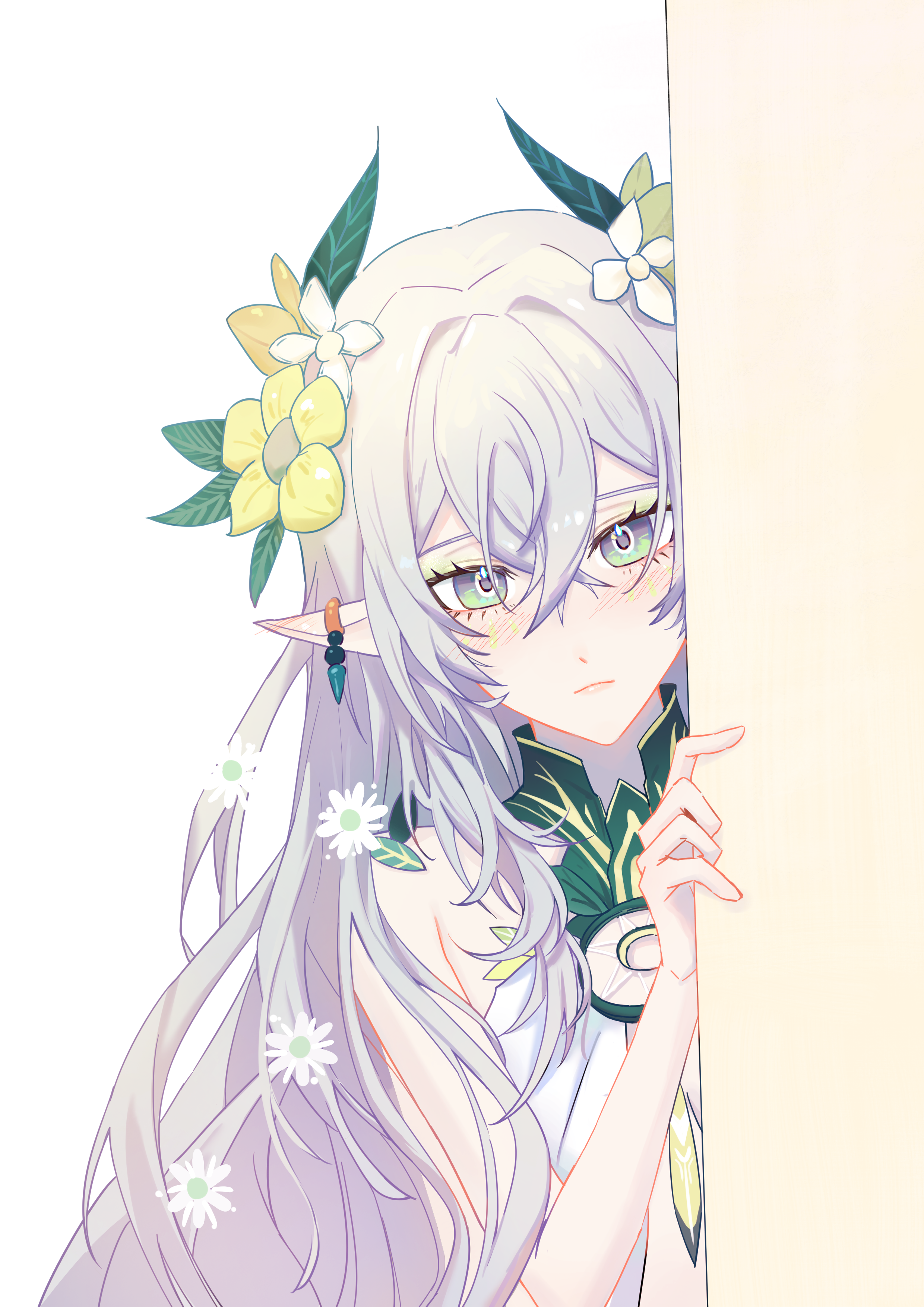 1girl absurdres bare_arms blush crossed_bangs flower green_eyes grey_hair hair_between_eyes hair_flower hair_ornament highres lamia:_lost_lullaby_(pgr) lamia:_lost_lullaby_(solitary_longings)_(pgr) lamia_(pgr) leaf_hair_ornament long_hair looking_at_viewer pointy_ears punishing:_gray_raven solo_focus white_background