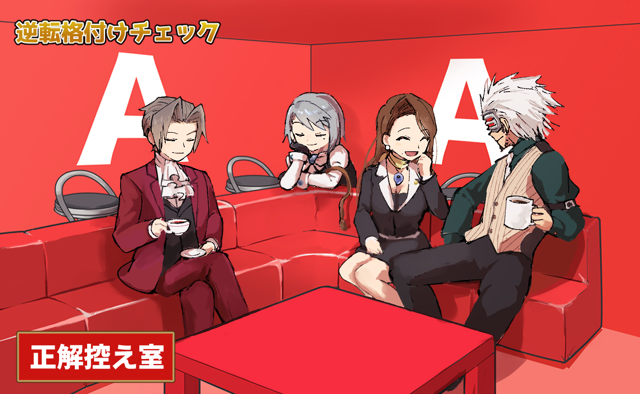 2boys 2girls ace_attorney black_pants black_skirt black_vest blue_hair brown_hair closed_eyes closed_mouth couch crossed_legs cup formal_clothes franziska_von_karma geinoujin_kakuzuke_check godot_(ace_attorney) green_shirt grey_hair holding holding_cup light_blue_hair light_smile long_hair long_sleeves magatama mia_fey miles_edgeworth mole mole_under_eye mole_under_mouth multiple_boys multiple_girls on_couch pants parody parted_bangs red_suit red_theme samusan100 shirt short_hair sitting skirt smile striped_clothes striped_vest suit tv_show vertical-striped_clothes vertical-striped_vest vest white_hair white_shirt