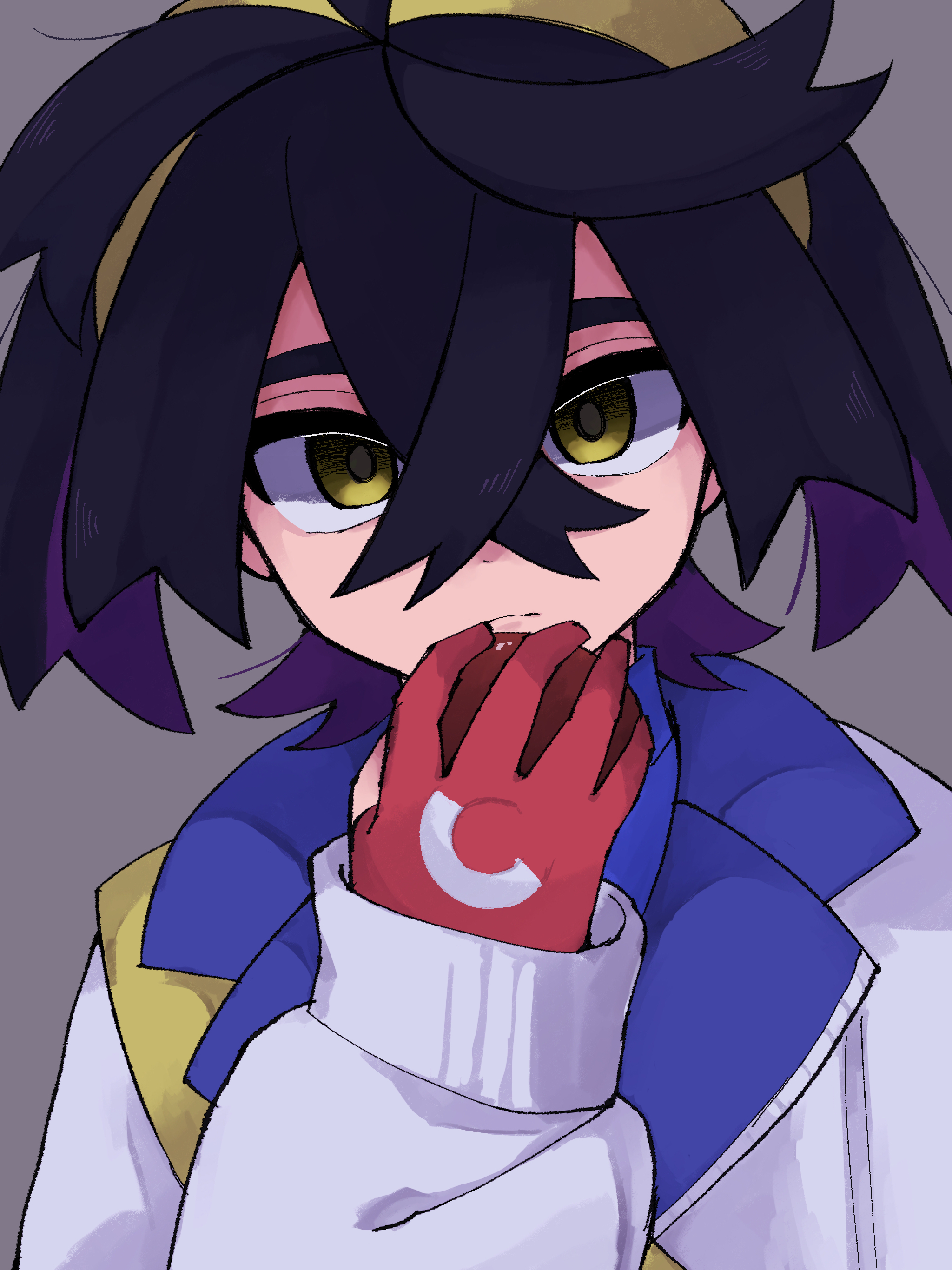 1boy 80pn absurdres black_hair brown_eyes closed_mouth colored_inner_hair frown gloves grey_background hair_between_eyes highres kieran_(pokemon) long_sleeves multicolored_hair nintendo partially_fingerless_gloves pokemon pokemon_scarlet_and_violet purple_hair red_gloves short_hair simple_background solo upper_body