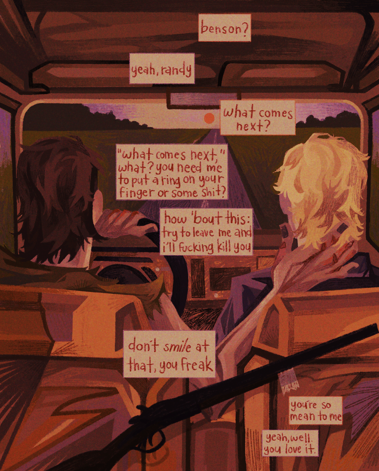2boys analogous_colors benson_(the_passenger) black_nails blonde_hair border brown_hair car commentary driving english_commentary english_text evening field from_behind green_shirt gun hand_on_another's_neck hatching_(texture) highres holding_steering_wheel horizon linear_hatching male_focus motor_vehicle multiple_boys no_lineart purple_border purple_shirt purple_sky quezify randy_bradley red_border red_sun rifle road shirt sitting sky speech_bubble steering_wheel sun sunset the_passenger tree vanishing_point wavy_hair weapon yaoi