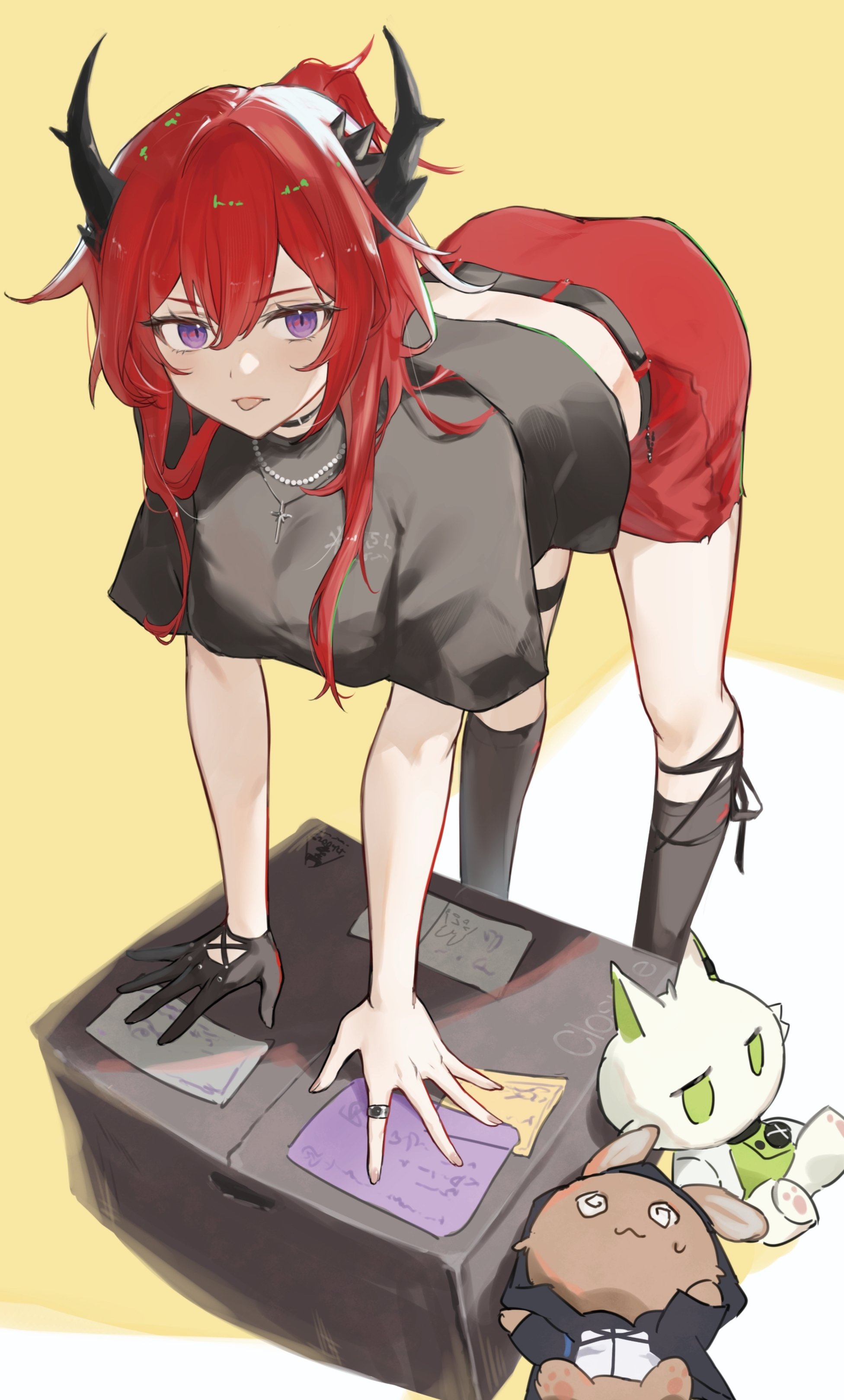 1girl 2naom8q6gt87292 absurdres arknights belt black_belt black_choker black_gloves black_shirt black_socks breasts character_doll choker commentary_request cross cross_necklace demon_horns denim denim_skirt doctor_(arknights) doll feet_out_of_frame gloves highres horns jewelry kal'tsit_(arknights) large_breasts leaning_forward long_hair looking_at_viewer midriff miniskirt necklace official_alternate_costume purple_eyes red_hair red_skirt ring shirt short_sleeves single_glove skirt socks stuffed_toy surtr_(arknights) surtr_(liberte_echec)_(arknights) tongue tongue_out two-tone_background white_background yellow_background