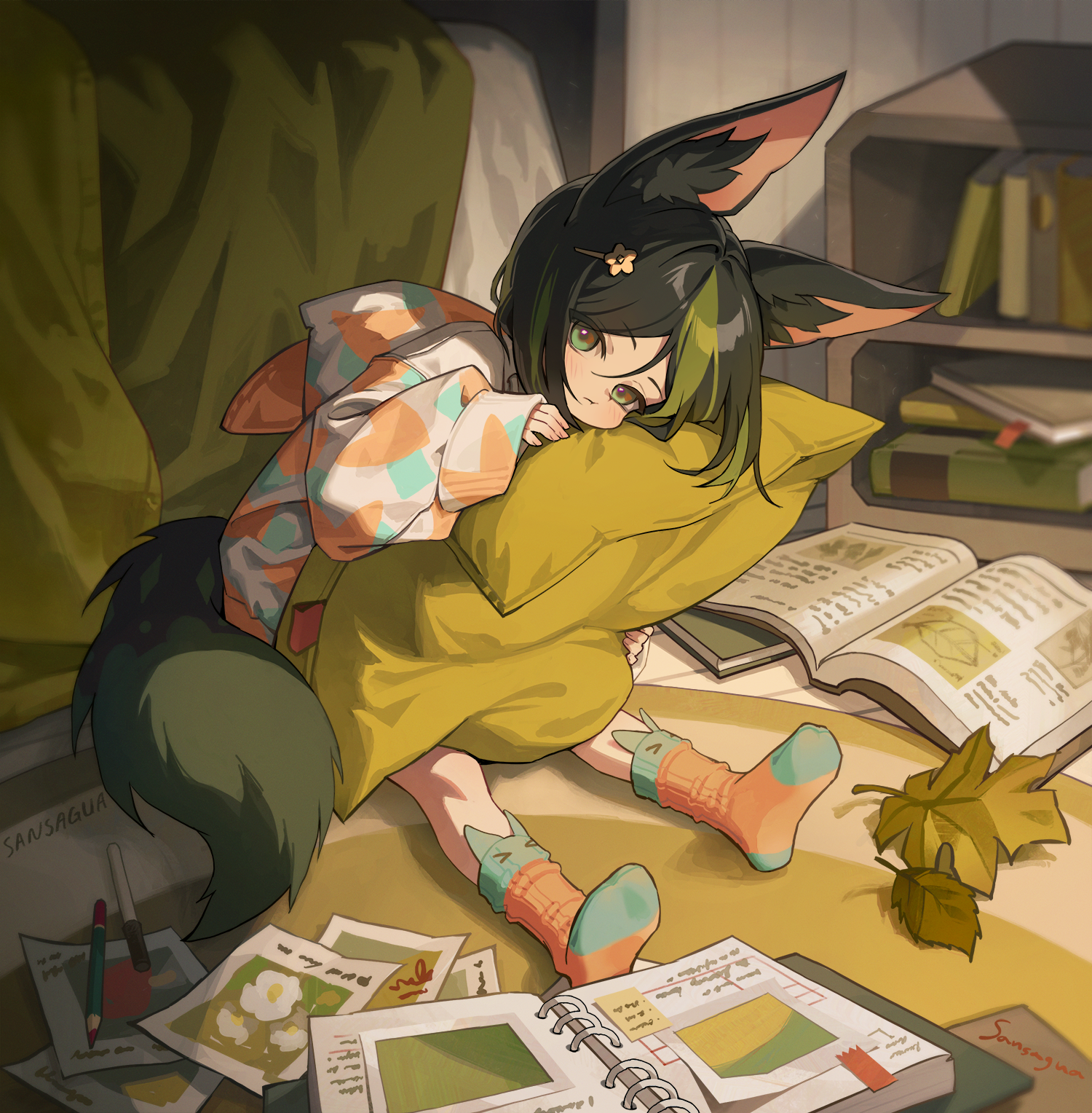 1boy animal_ear_fluff animal_ears blush book child closed_mouth fox_boy fox_ears fox_tail genshin_impact green_eyes green_hair green_tail hair_ornament hairpin head_rest highres hood hood_down indoors leaf looking_at_viewer male_focus medium_hair multicolored_eyes multicolored_hair pajamas paper pillow rug sansaguaart shelf sitting socks solo streaked_hair tail tighnari_(genshin_impact) two-tone_eyes
