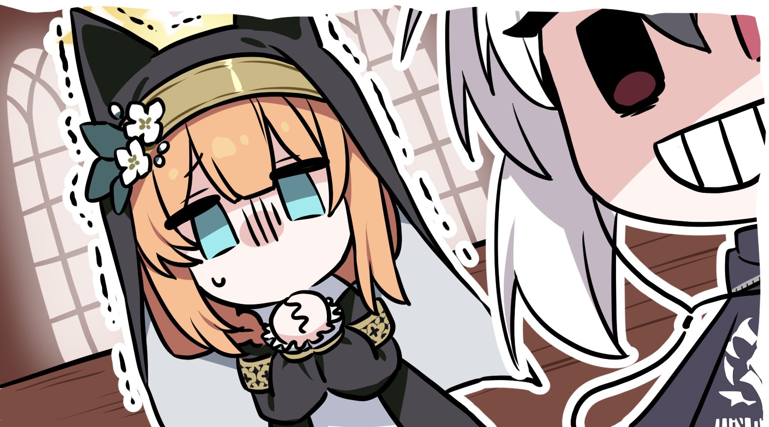 2girls animal_ear_headwear armband atsuko's_grin_(meme) b.t._(boob_tong) black_hoodie blue_archive blue_eyes cathedral church coif fake_animal_ears flower grin habit hair_flower hair_ornament halo hood hoodie kayoko_(blue_archive) mari_(blue_archive) meme multiple_girls nun orange_hair own_hands_together pew praying print_hoodie red_eyes smile sweat teeth trembling white_flower white_hair window yellow_armband yellow_halo