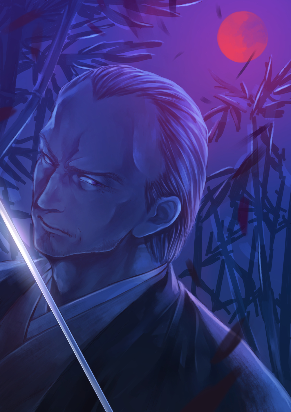 1boy bamboo bamboo_forest closed_mouth fate/grand_order fate_(series) forest highres looking_at_viewer male_focus moon mushi_ari_yoshi nature night old old_man purple_sky red_moon sky solo sword upper_body weapon widow's_peak wrinkled_skin yagyuu_munenori_(fate)