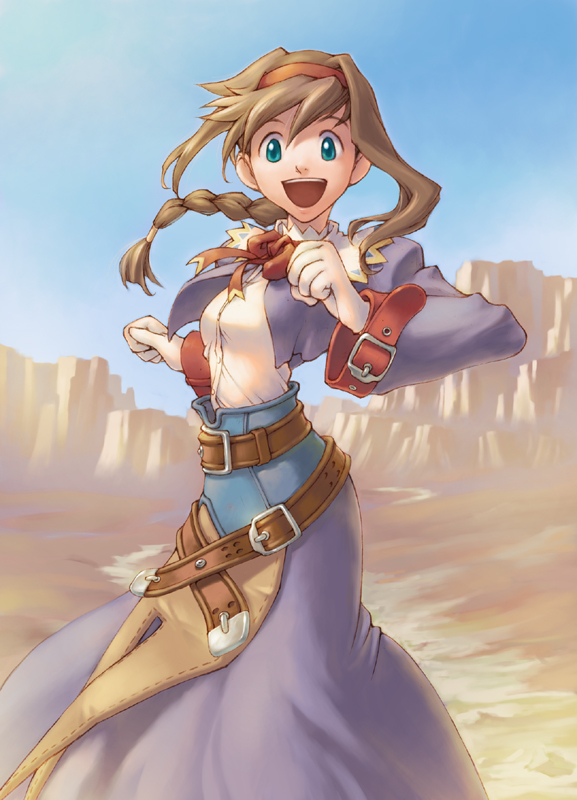 1girl :d :p aqua_eyes belt bow braid brown_hair canyon coat day dress female_focus furuu gloves hairband happy long_hair open_mouth purple_dress red_hairband ribbon sidelocks sky smile solo tongue tongue_out virginia_maxwell wild_arms wild_arms_3