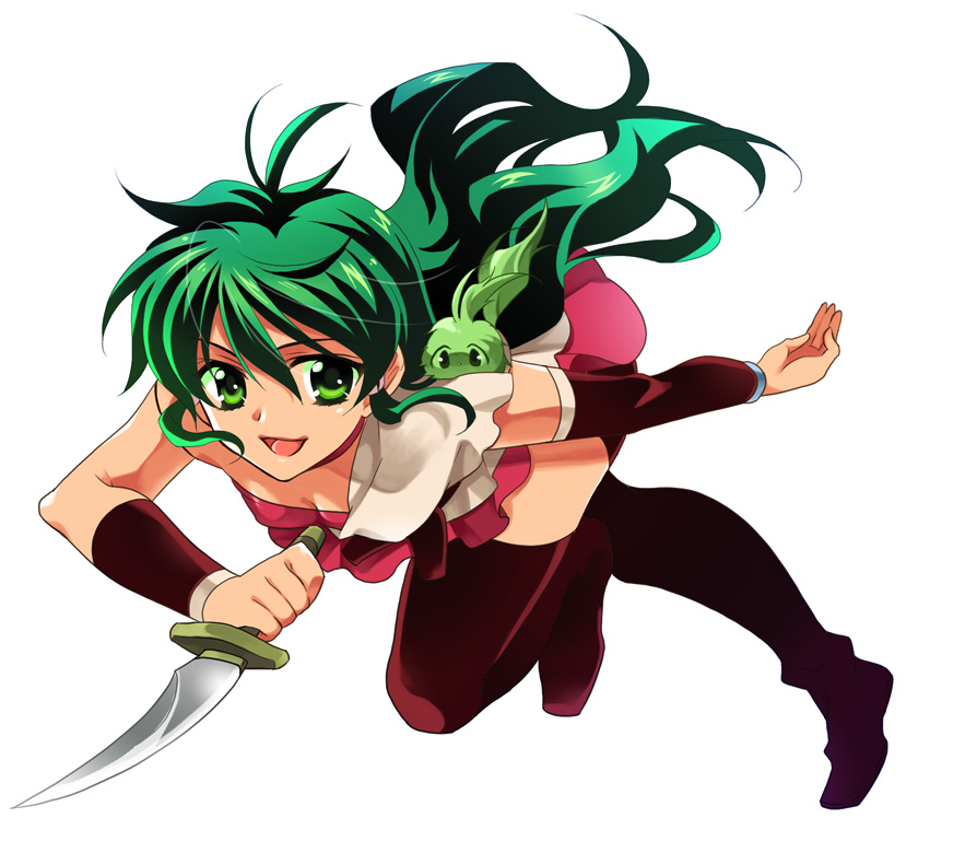 00s ahoge choker creature dagger deltora_quest full_body green_eyes green_hair holding holding_dagger holding_knife holding_weapon jasmine_(deltora_quest) knife long_hair messy_hair open_mouth running shuragyoku_mami simple_background skirt smile solo thighhighs weapon