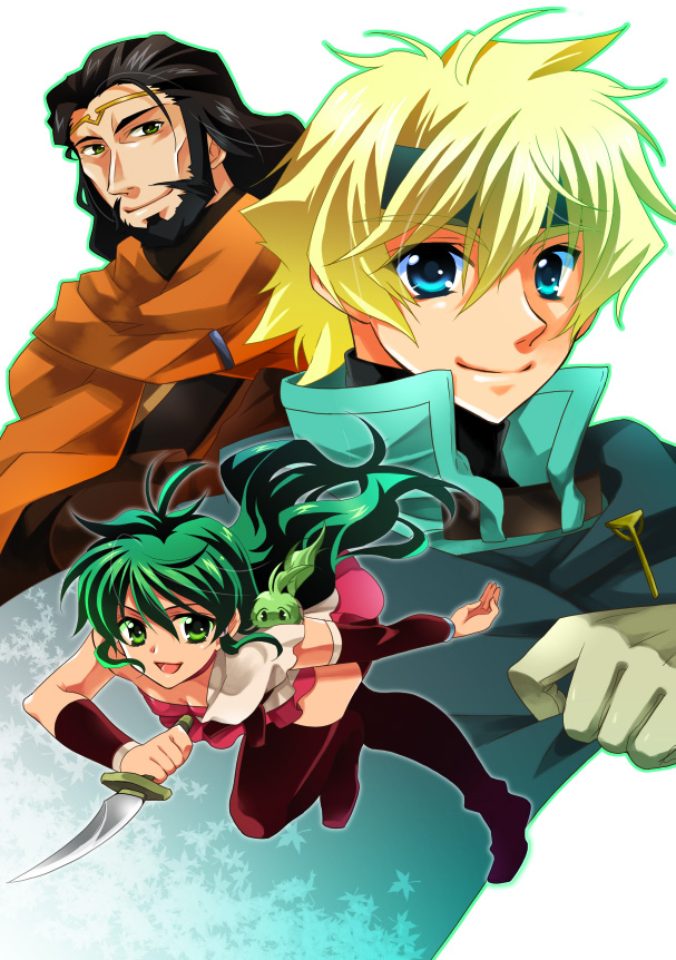 00s 1girl 2boys ahoge barda beard black_facial_hair black_hair blonde_hair blue_eyes choker creature dagger deltora_quest facial_hair full_body gloves green_eyes green_hair headband holding holding_dagger holding_knife holding_weapon jasmine_(deltora_quest) knife leif_(deltora_quest) lief_(deltora_quest) long_hair messy_hair multiple_boys running scarf shuragyoku_mami simple_background skirt smile thighhighs weapon