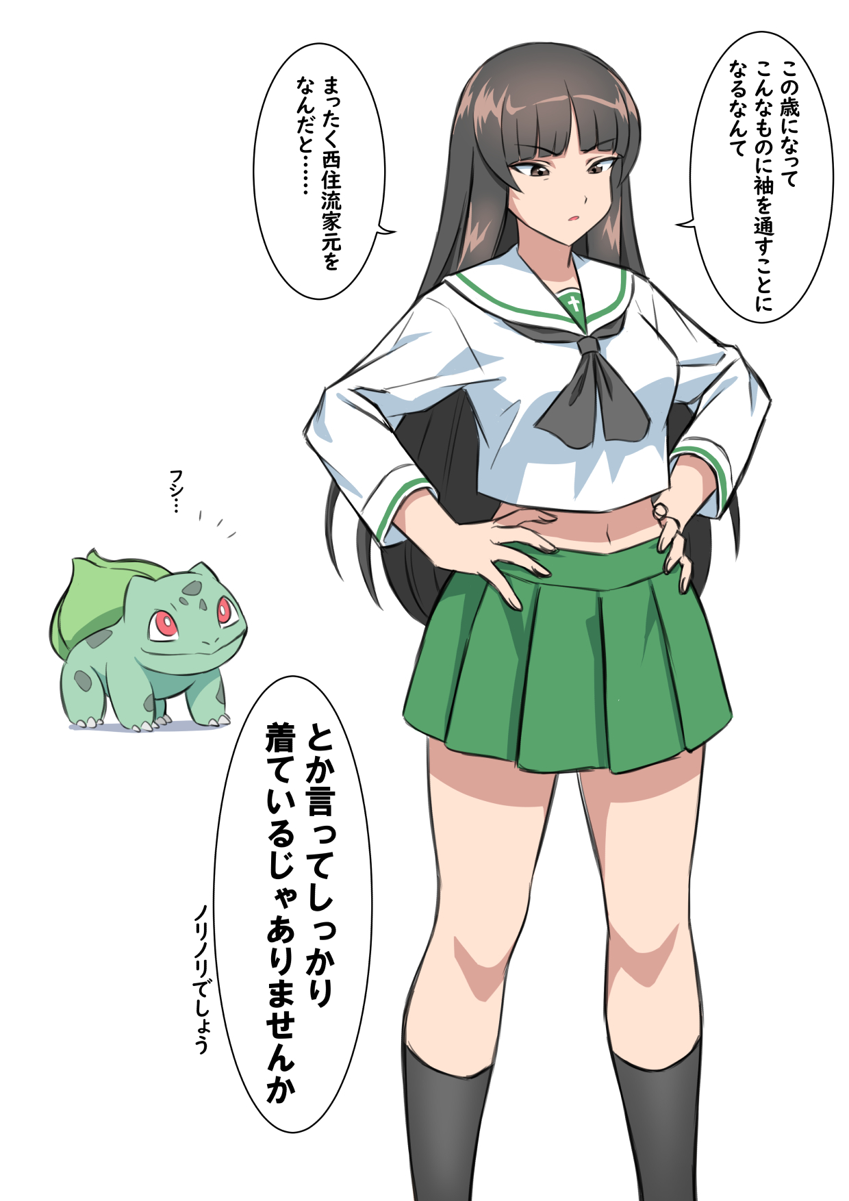 1girl black_socks blunt_bangs brown_eyes brown_hair bulbasaur cropped_shirt gen_1_pokemon girls_und_panzer green_skirt ha_ku_ronofu_jin highres long_hair midriff navel nintendo nishizumi_shiho ooarai_school_uniform pokemon pokemon_(creature) sailor_collar school_uniform simple_background skirt socks solo speech_bubble white_background
