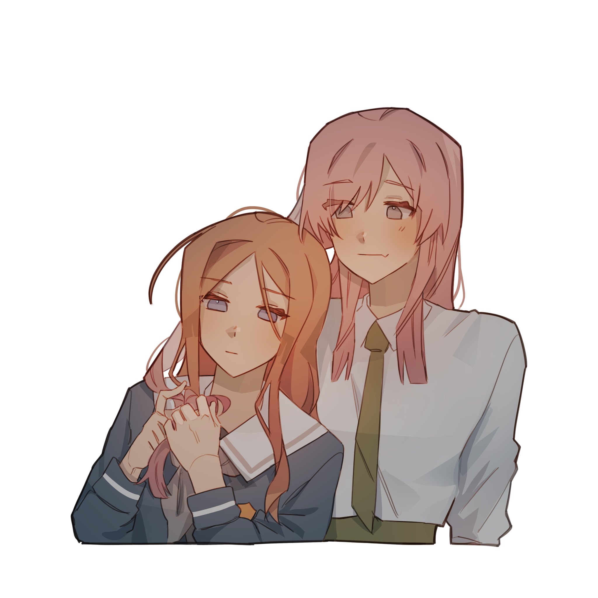 2girls bang_dream! bang_dream!_it's_mygo!!!!! blue_eyes blue_shirt blush brown_hair chihaya_anon closed_mouth collared_shirt commentary commission english_commentary fang green_necktie grey_eyes hand_in_another's_hair highres long_hair long_sleeves looking_at_another michiiyuri multiple_girls nagasaki_soyo necktie pink_hair school_uniform second-party_source shirt simple_background skin_fang tsukinomori_school_uniform tying_another's_hair tying_hair upper_body white_background white_shirt yuri