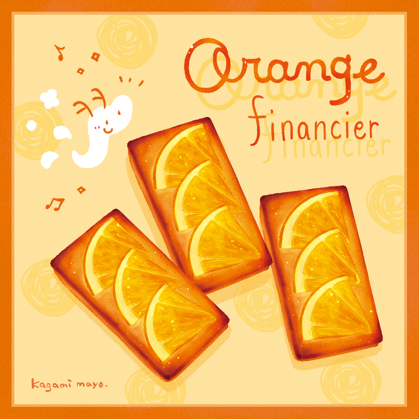 artist_name financier_(food) food food_focus food_name fruit highres kagami_mayo musical_note no_humans orange_(fruit) orange_slice original yellow_background
