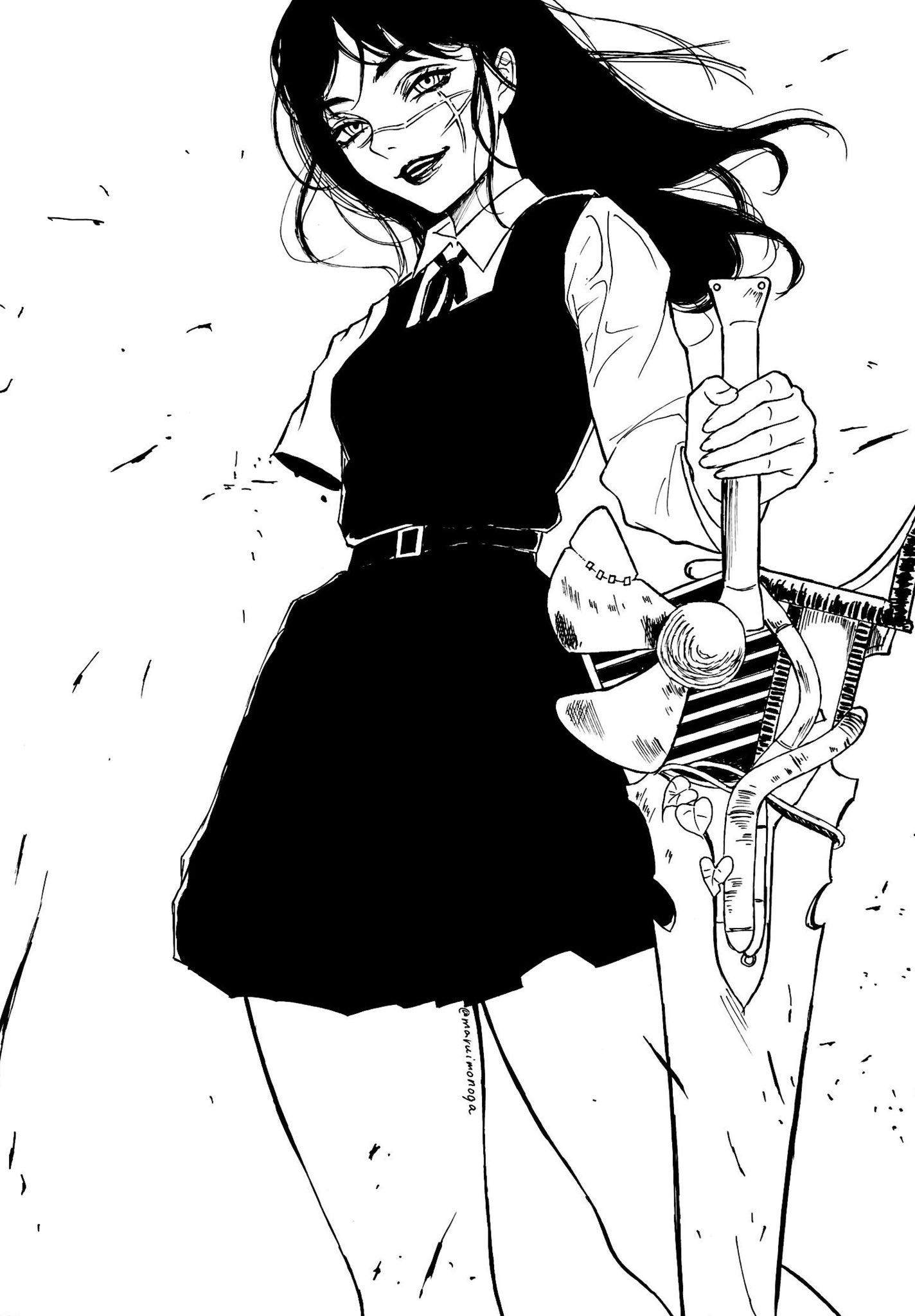 1girl amputee armless_amputee chainsaw_man collared_shirt dress facial_scar fourth_east_high_school_uniform greyscale highres long_hair maruimonoga monochrome neck_ribbon ribbon ringed_eyes scar scar_on_cheek scar_on_face school_uniform shirt solo sword twitter_username weapon yoru_(chainsaw_man)