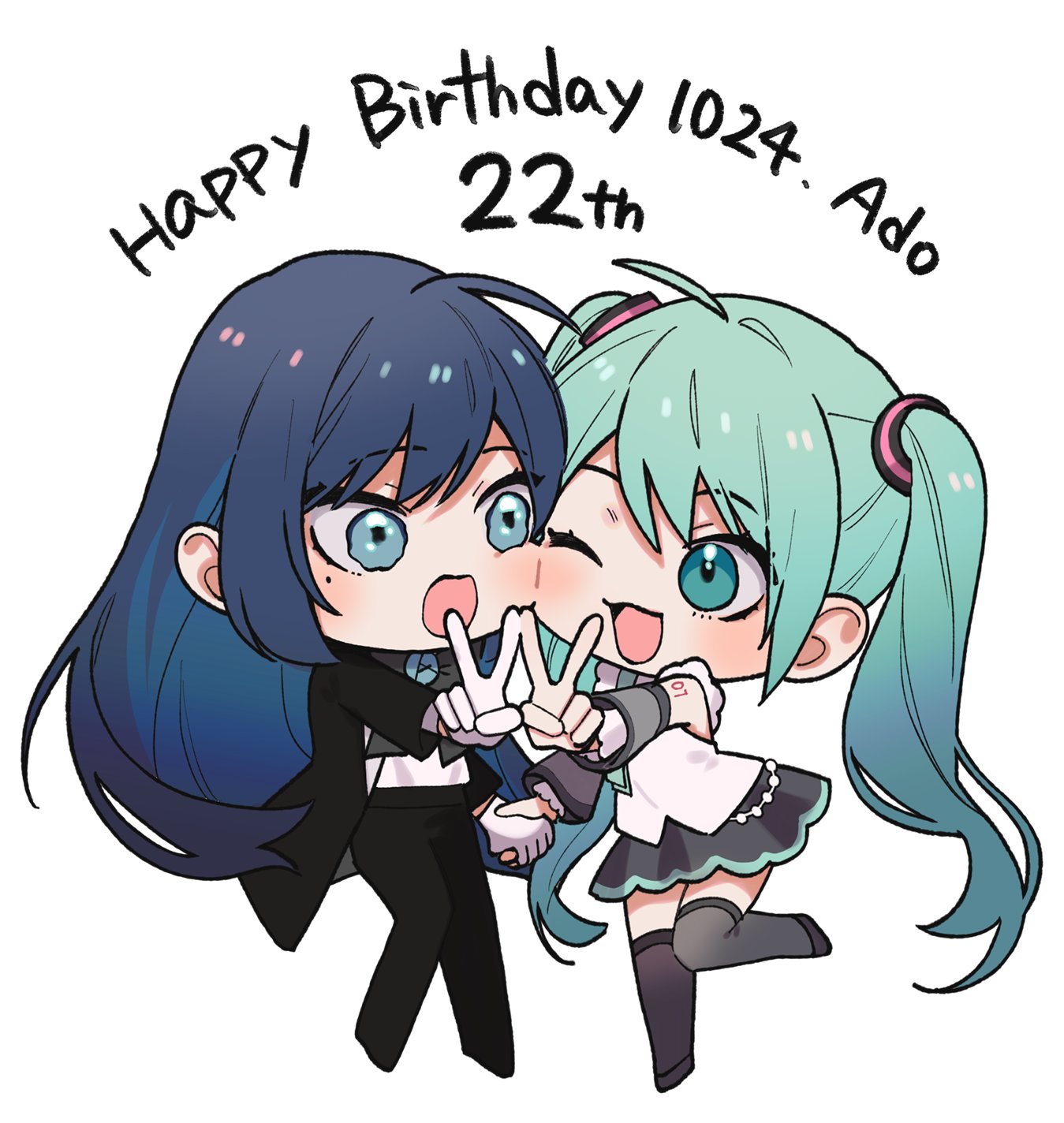 2girls ado_(utaite) aqua_eyes aqua_hair black_coat black_pants black_skirt blue_eyes blue_hair boots chando_(ado) character_name cheek_press chibi chibi_only coat colored_inner_hair commentary_request dated detached_sleeves gloves happy_birthday hatsune_miku highres holding_hands long_hair mole mole_under_eye multicolored_hair multiple_girls one_eye_closed open_clothes open_coat open_mouth pants riseno shirt simple_background skirt sleeveless sleeveless_shirt thigh_boots thighhighs twintails utaite v very_long_hair vocaloid white_background white_gloves white_shirt zettai_ryouiki