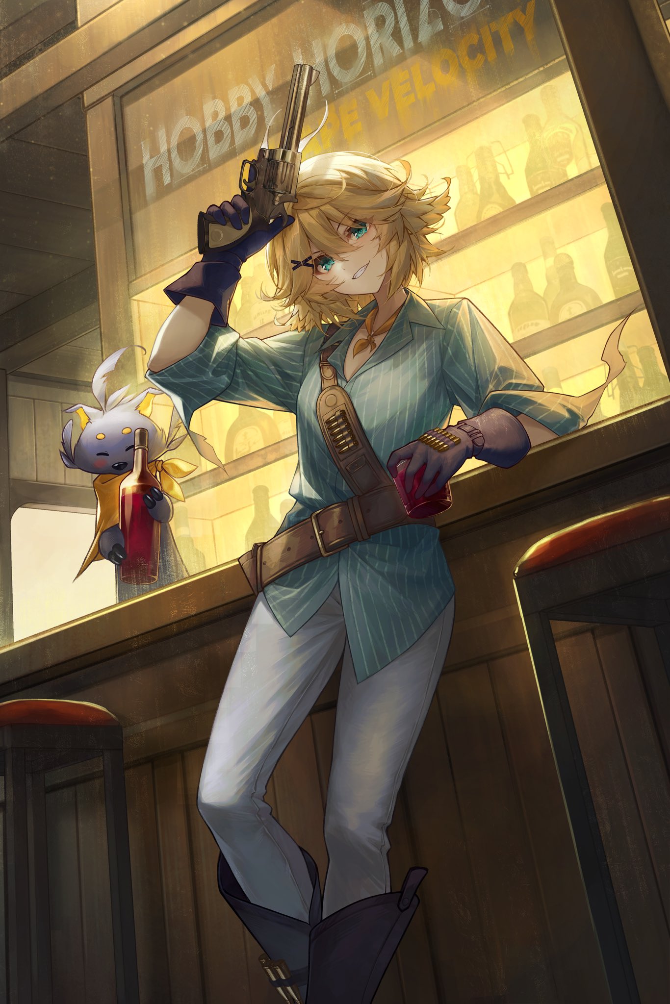 1girl alcohol aqua_eyes aqua_shirt bar_(place) bar_stool belt black_footwear black_gloves blonde_hair bottle brown_belt cartridge cup doki_amber_doge_(dokibird) dokibird dokibird_(bounty_hunter) drinking_glass dutch_angle english_text feet_out_of_frame from_below gloves gun hair_ornament hairclip handgun highres holding holding_cup holding_weapon ijac_ray indie_virtual_youtuber indoors leaning_on_table looking_at_viewer medium_hair neckerchief orange_neckerchief pants revolver shirt sleeves_pushed_up smile smoke smoking_barrel solo stool untucked_shirt virtual_youtuber weapon white_pants wine_bottle