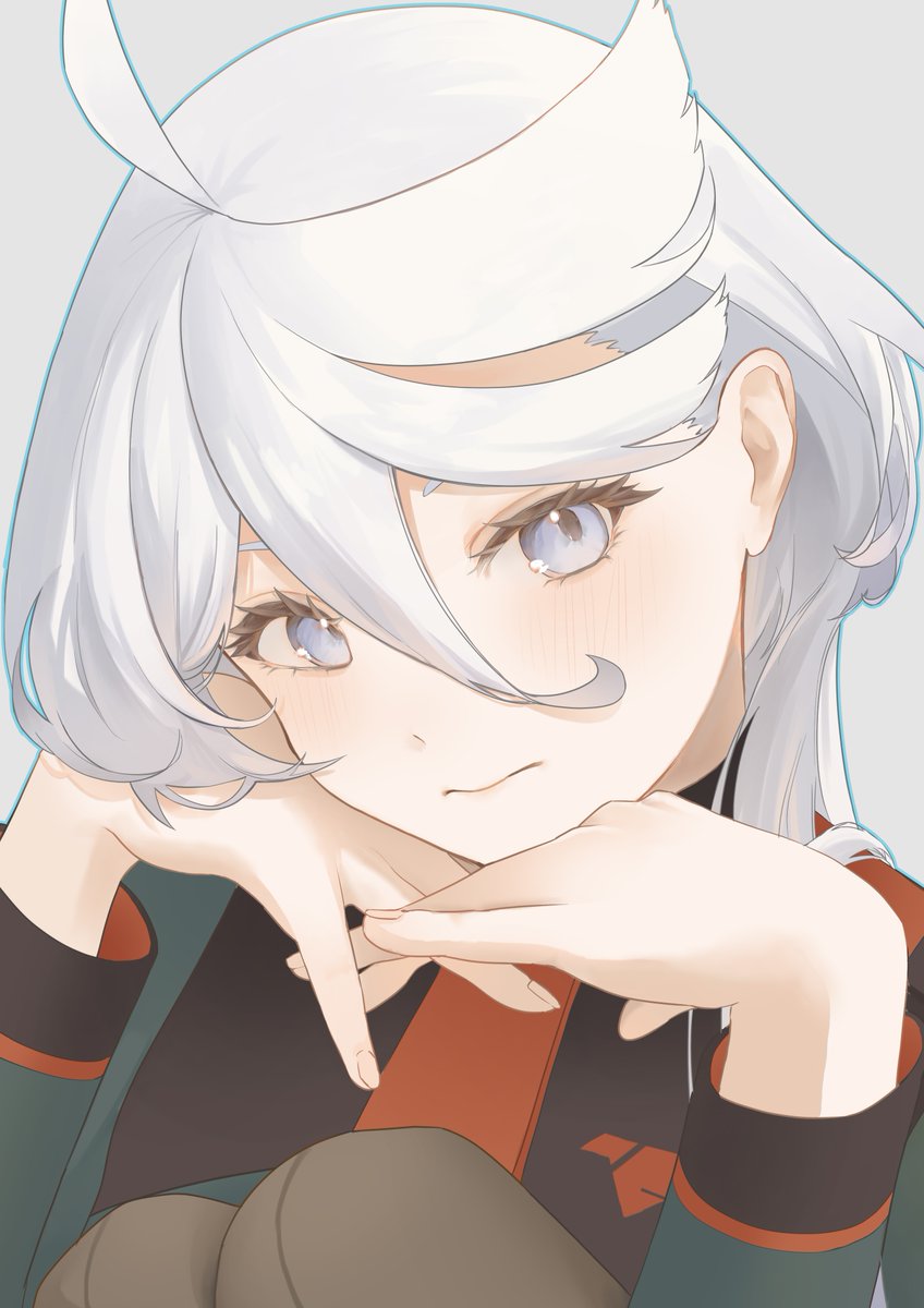 1girl asticassia_school_uniform black_pantyhose blue_outline blush closed_mouth commentary green_jacket grey_background grey_eyes gundam gundam_suisei_no_majo hashtag-only_commentary highres jacket long_sleeves looking_at_viewer miorine_rembran myamyamyako outline pantyhose school_uniform simple_background solo white_hair