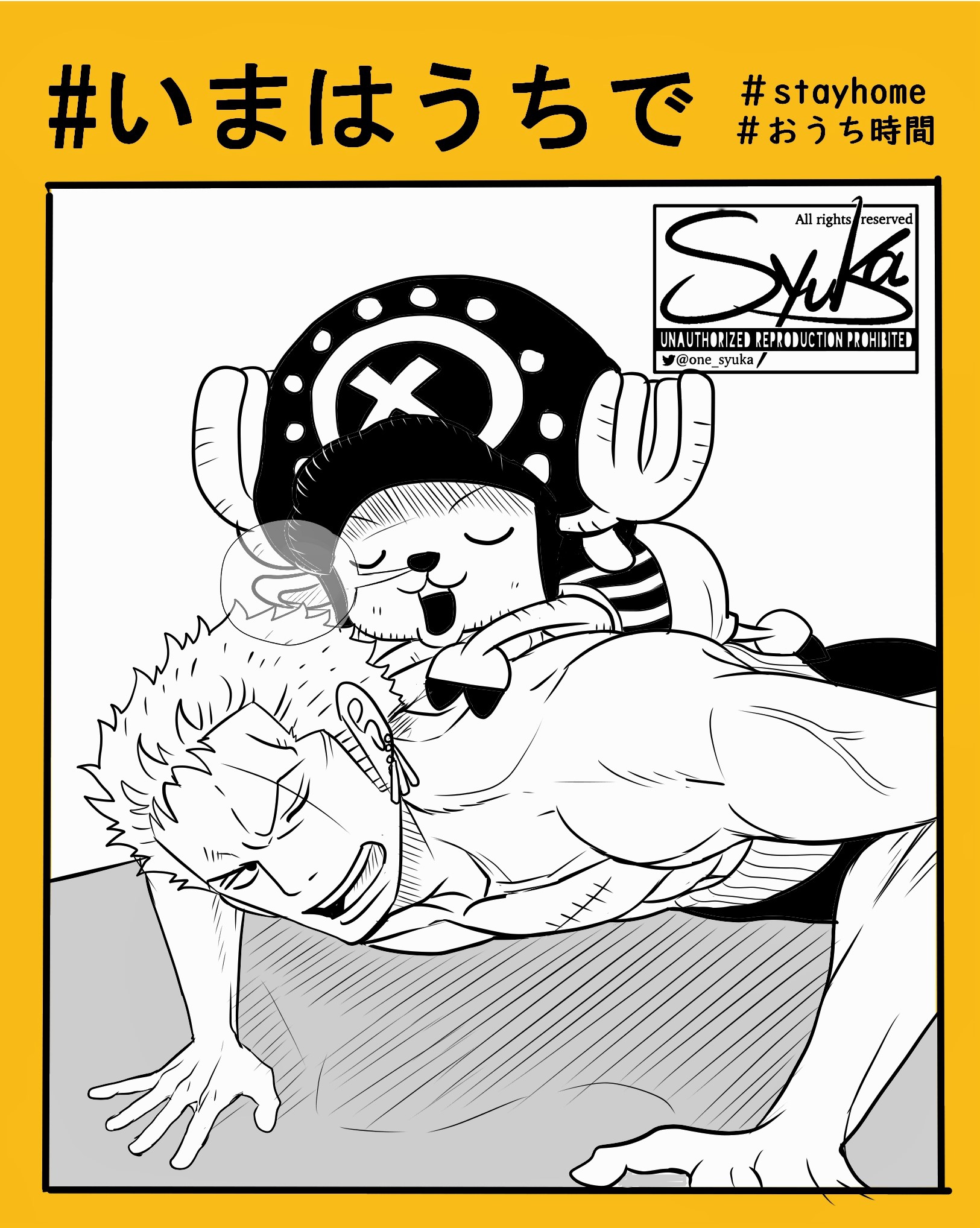 2boys antlers border commentary_request earrings exercising greyscale hat highres horns jewelry male_focus monochrome multiple_boys one_eye_closed one_piece one_syuka open_mouth push-ups reindeer_antlers roronoa_zoro scar scar_across_eye scar_on_face shirt short_hair sleeping sleeping_on_person squeans stitched_torso stitches striped_clothes striped_shirt tony_tony_chopper topless_male vertical-striped_clothes vertical-striped_shirt yellow_border