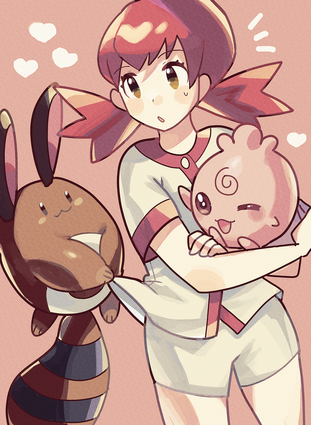 1girl :o anidler91 brown_eyes gen_2_pokemon heart highres holding holding_pokemon igglybuff nintendo open_mouth pink_background pink_hair pink_trim pokemon pokemon_(creature) pokemon_gold/silver/crystal sentret shirt shirt_tug short_hair short_sleeves shorts sweat twintails white_shirt white_shorts whitney_(pokemon)
