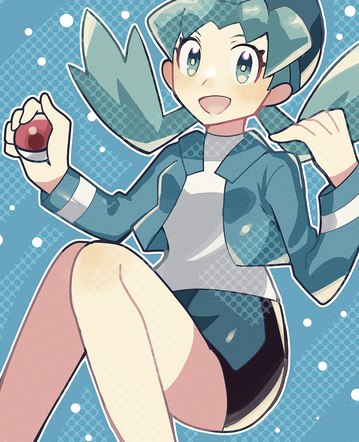 1girl :d alternate_color anidler91 black_shorts blue_background blue_eyes blue_hair blue_hat blue_jacket blue_shorts commentary_request cropped_jacket feet_out_of_frame hands_up hat highres holding holding_poke_ball jacket knees_together_feet_apart kris_(pokemon) long_hair long_sleeves nintendo open_clothes open_jacket open_mouth outline poke_ball poke_ball_(basic) pokemon pokemon_masters_ex shirt shorts sitting smile solo twintails two-tone_shorts white_outline white_shirt