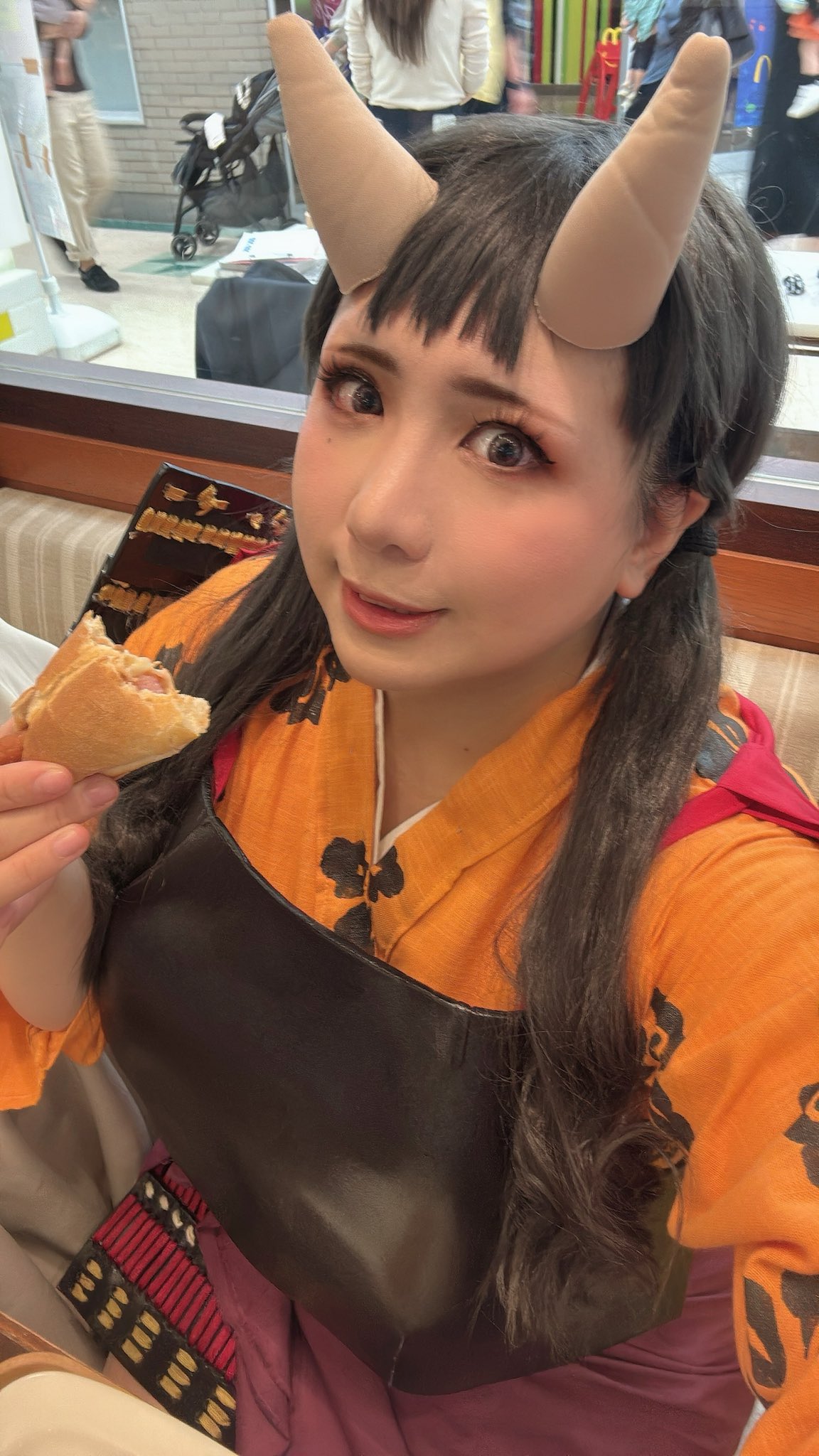 1girl black_hair chouzuki_maryou dungeon_meshi east_asian highres horns lipstick makeup oni photo_(medium) plump solo twintails