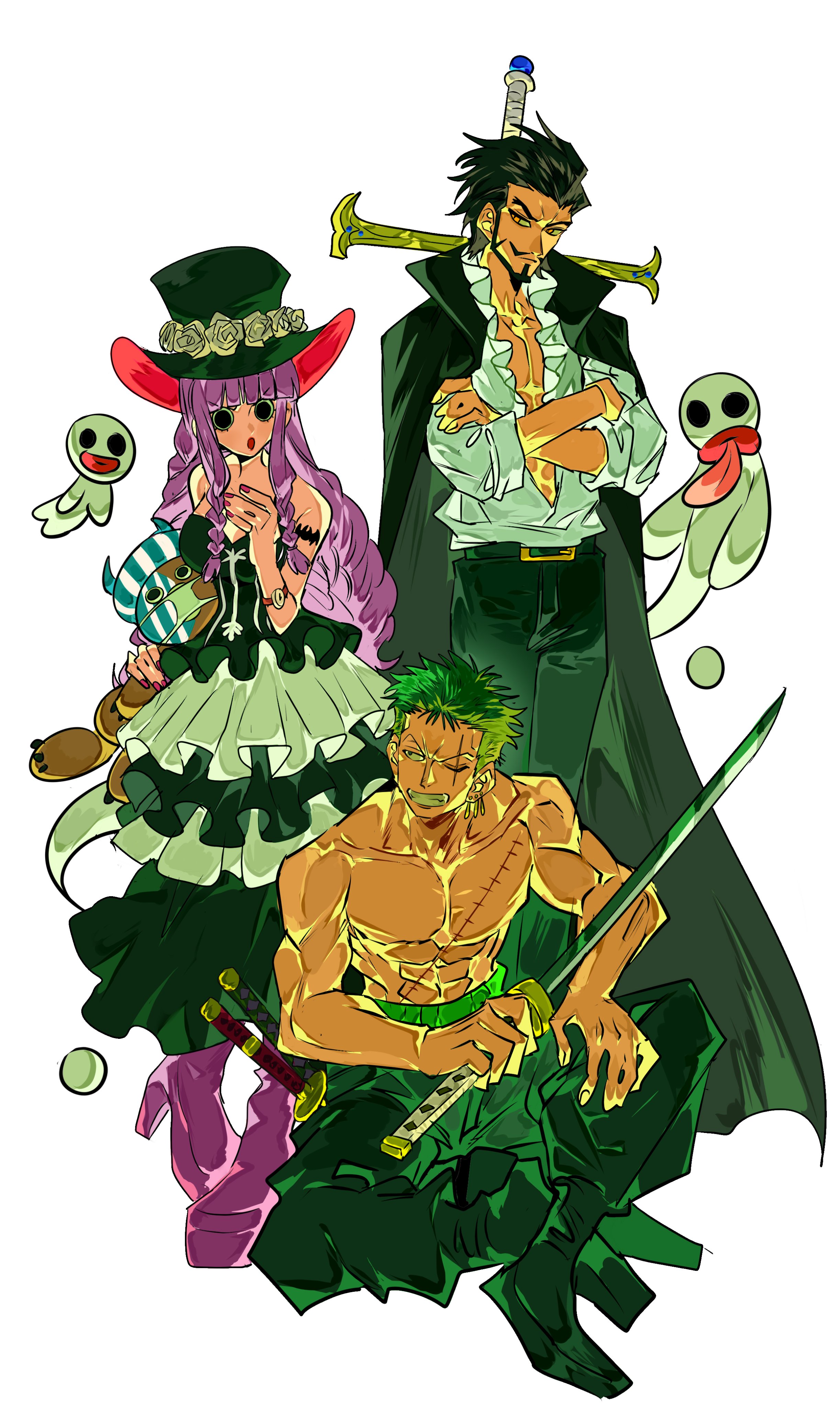 1girl 2boys absurdres beard black_eyes black_hair black_pants blunt_bangs boots braid braided_sidelock commentary_request crossed_arms dracule_mihawk dress drill_hair earrings facial_hair flower frilled_dress frilled_shirt frills full_body ghost green_hair haramaki hat high_heel_boots high_heels highres holding holding_sword holding_weapon japanese_clothes jewelry kimono kumacy long_hair male_focus multiple_boys one_piece pants perona pink_boots pink_hair roronoa_zoro rose scar scar_across_eye scar_on_face shirt short_hair simple_background stitched_torso stitches sword sword_on_back tongue tongue_out top_hat topless_male weapon weapon_on_back white_background white_flower white_rose xi_luo_an_ya yellow_eyes