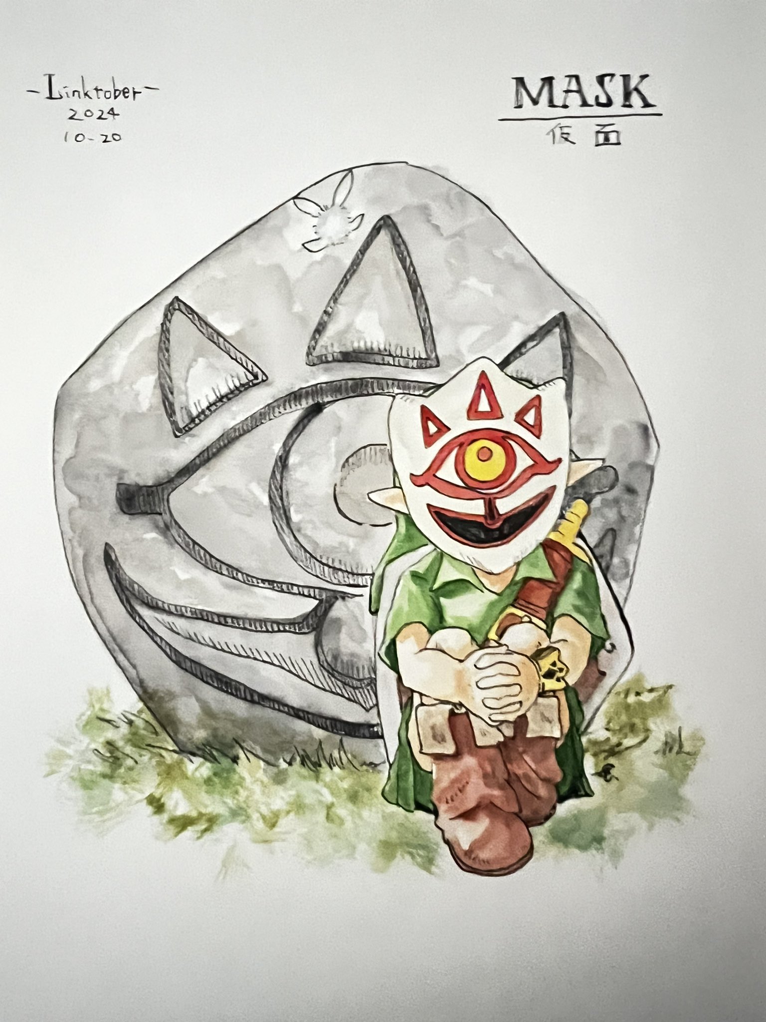 1boy 2024 boots bracelet brown_boots fairy gossip_stone grass green_tunic hat highres interlocked_fingers jewelry link mask mask_of_truth nana_mochi777 navi nintendo painting_(medium) pointy_ears shield shield_on_back sitting solo sword sword_on_back the_legend_of_zelda the_legend_of_zelda:_ocarina_of_time traditional_media tunic watercolor_(medium) weapon weapon_on_back young_link