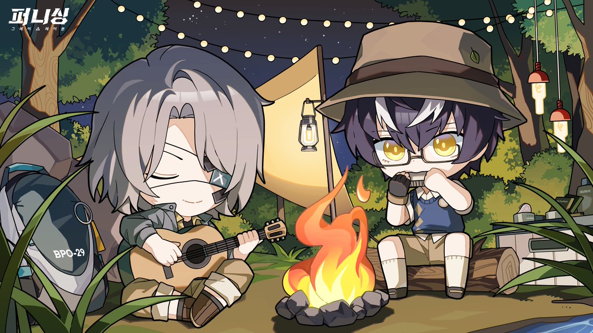 2boys alternate_costume bonfire camping casual chibi fire guitar instrument multiple_boys music night noan:_arca_(pgr) noan_(pgr) official_art playing_guitar playing_instrument punishing:_gray_raven sky watanabe:_epitaph_(pgr) watanabe_(pgr)