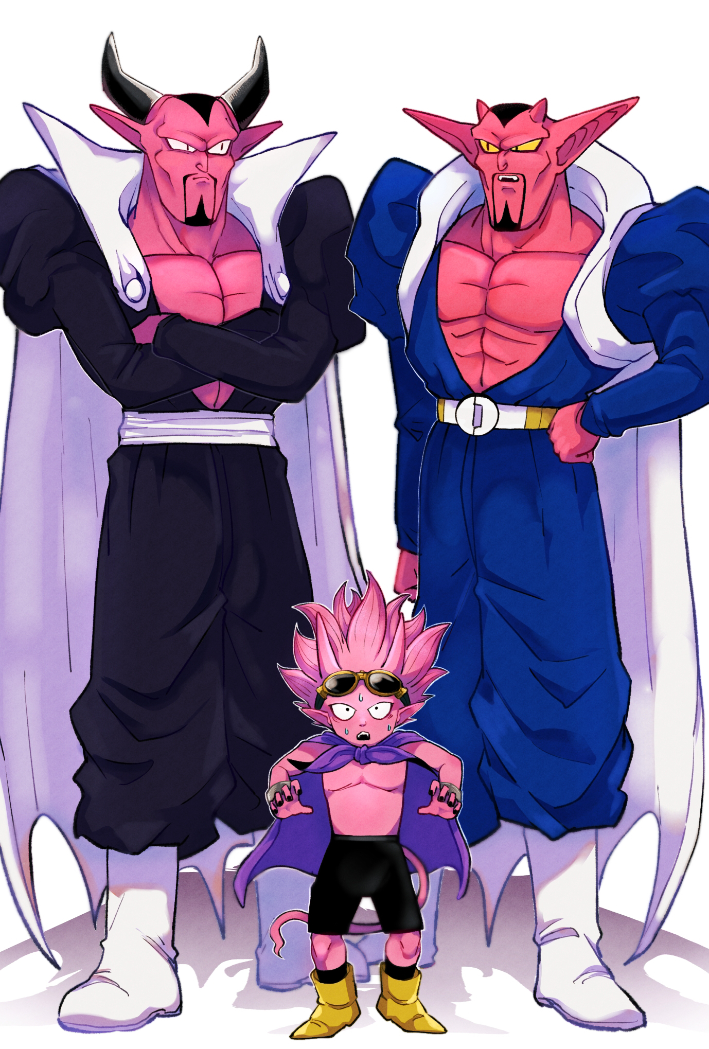 3boys beelzebub_(sand_land) black_hair black_nails black_shorts boots cape cheekbones colored_sclera colored_skin commentary_request creator_connection crossed_arms crossover d_norainu_b dabura demon_boy dragon_ball dragonball_z facial_hair fangs father_and_child father_and_son goggles goggles_on_head hand_on_own_hip highres horns juliet_sleeves long_sleeves look-alike looking_at_another multiple_boys muscular muscular_male open_clothes open_mouth open_shirt parent_and_child pink_hair pink_skin pink_tail pointy_ears puffy_sleeves purple_cape sand_land satan_(sand_land) short_hair shorts slit_pupils spiked_hair sweatdrop tail topless_male trait_connection very_short_hair white_background white_cape white_footwear wide-eyed yellow_boots yellow_sclera