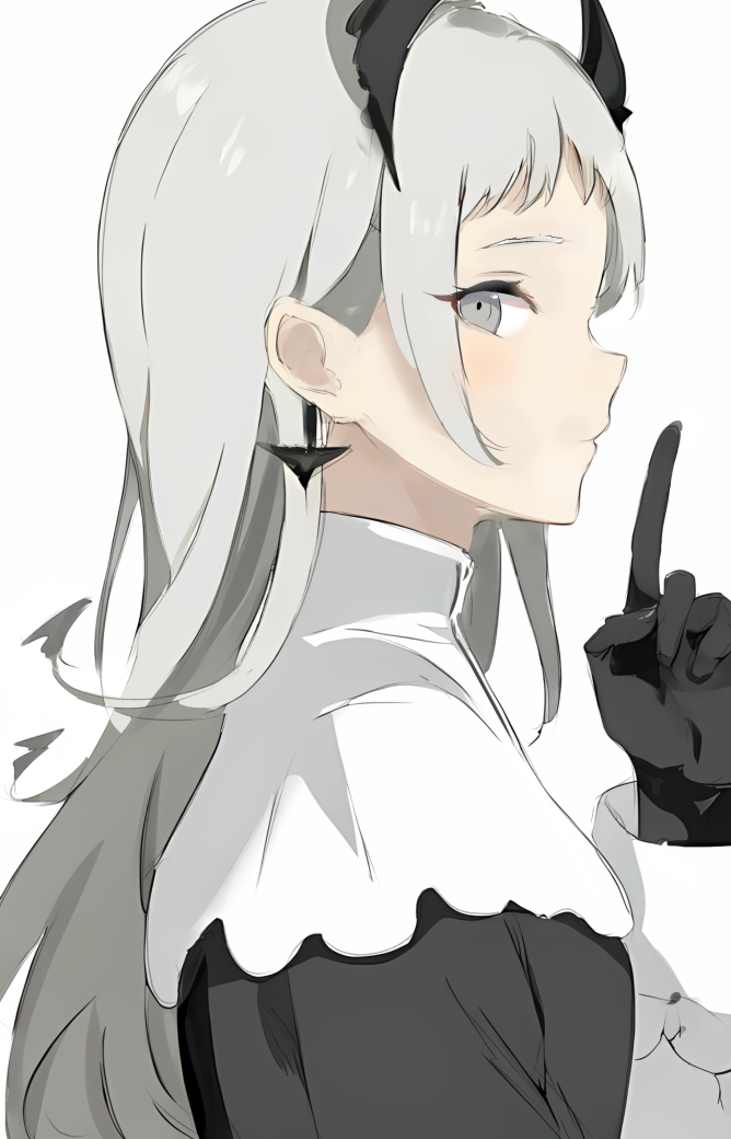 1girl arknights black_gloves finger_to_mouth from_side gloves grey_eyes grey_hair hand_up index_finger_raised irene_(arknights) long_hair long_sleeves looking_at_viewer profile raifu_(rf) shushing sideways_glance simple_background sketch solo upper_body white_background