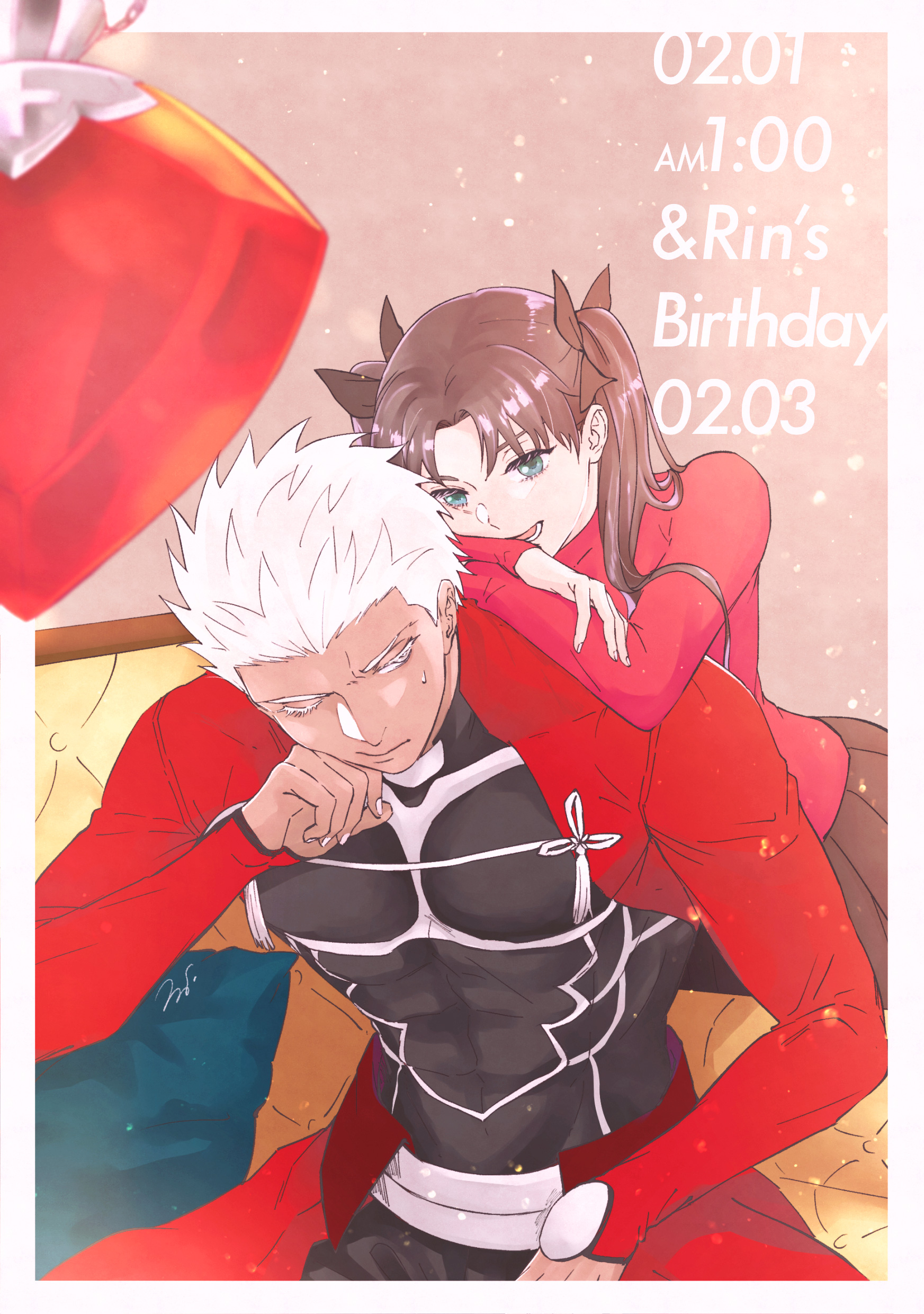 1boy 1girl absurdres archer_(fate) birthday border bow colored_eyelashes eyelashes fate/stay_night fate_(series) grey_eyes hair_bow highres leaning_on_person light_particles long_hair mushi_ari_yoshi open_mouth pectorals pleated_skirt red_sweater skirt sweater tohsaka_rin twintails white_border white_hair