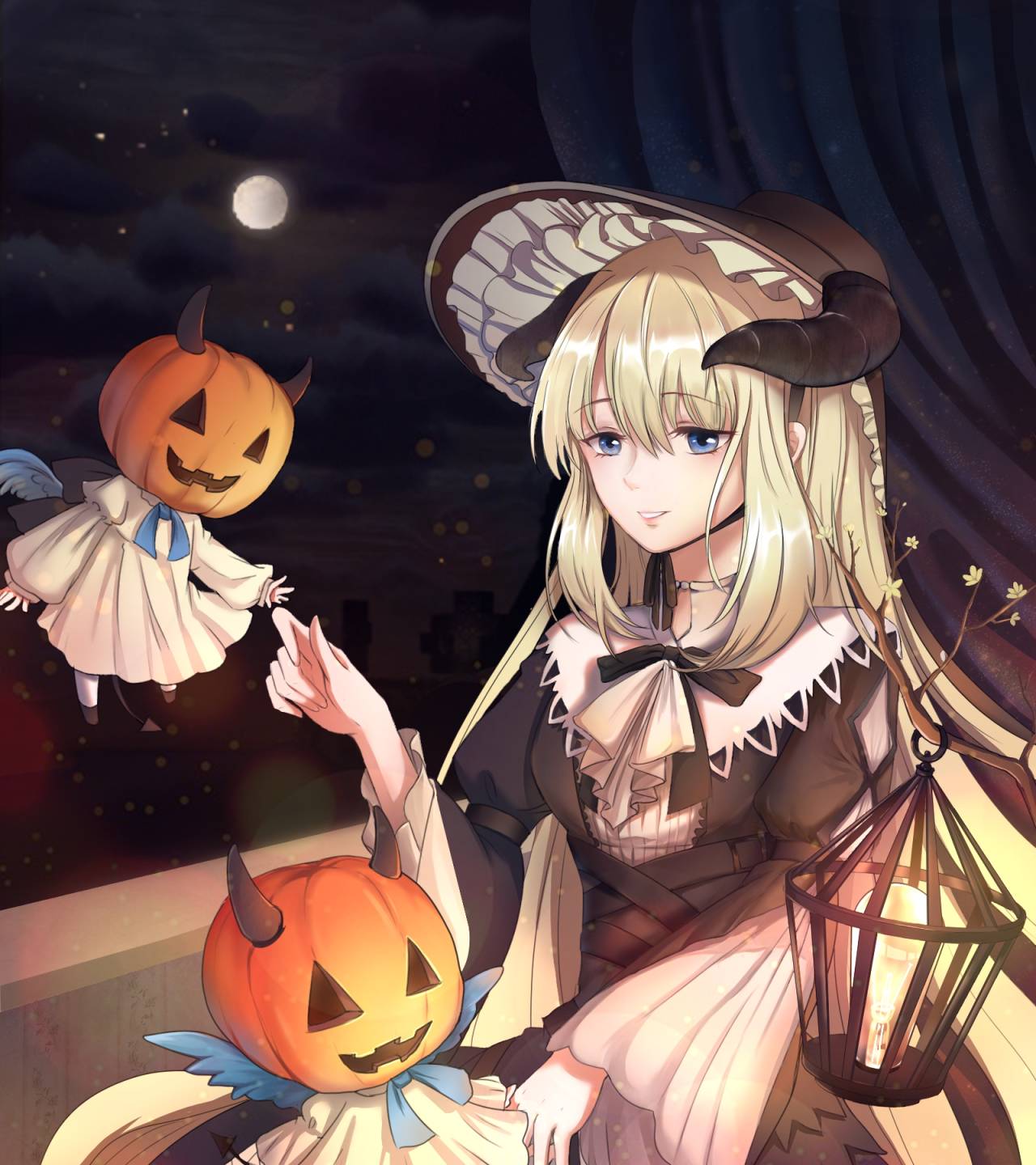 1girl arknights ascot black_dress black_horns black_ribbon blonde_hair blue_eyes blue_ribbon bonnet candlestand chinstrap cowboy_shot curled_horns demon_horns dress frilled_ascot frilled_hat frills full_moon hair_between_eyes halloween hat highres horns horns_through_headwear lantern long_hair long_sleeves miaowu_miaoha moon nightingale_(an_elegy)_(arknights) nightingale_(arknights) official_alternate_costume parted_lips pumpkin ribbon sitting solo white_ascot white_dress