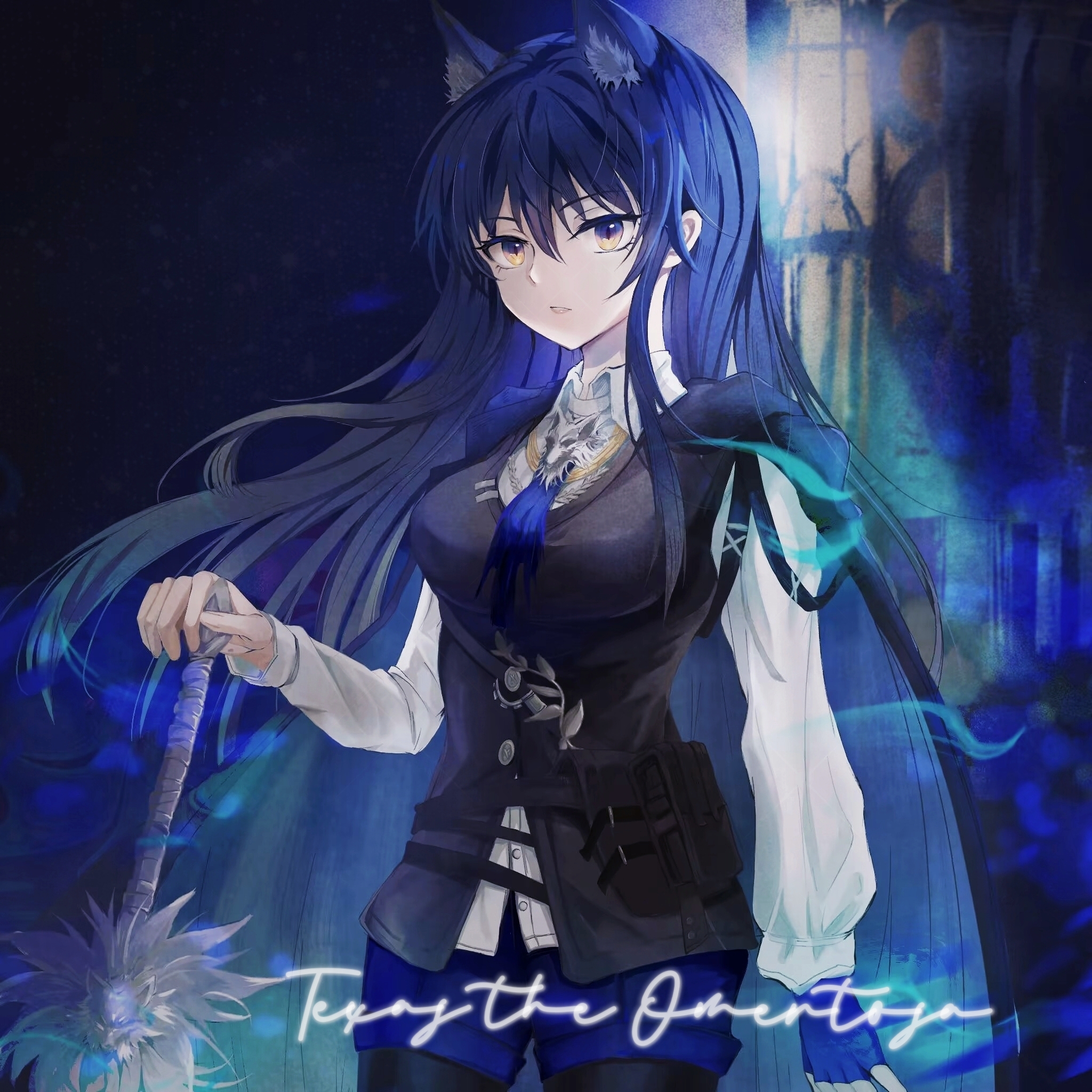 1girl animal_ear_fluff animal_ears arknights black_cape black_hair black_pantyhose black_vest blue_eyes blue_gloves blue_necktie blue_shorts cape chinese_commentary collared_shirt commentary_request cowboy_shot extra_ears fingerless_gloves gloves gradient_eyes highres holding holding_sword holding_weapon long_hair long_sleeves looking_at_viewer miaowu_miaoha multicolored_eyes necktie pantyhose pantyhose_under_shorts parted_lips shirt shorts single_glove solo sword texas_(arknights) texas_the_omertosa_(arknights) vest weapon white_shirt wolf_ears wolf_girl yellow_eyes