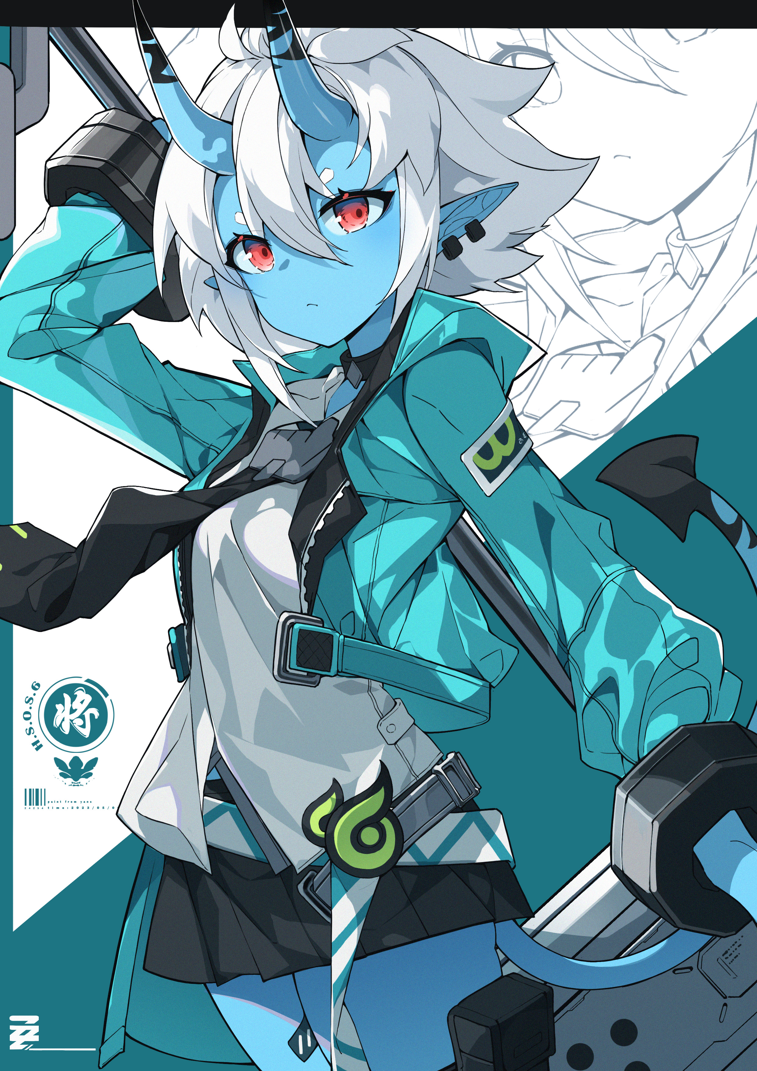 1girl absurdres black_necktie black_skirt blue_skin closed_mouth colored_skin cowboy_shot green_jacket hair_between_eyes highres holding holding_weapon horns jacket looking_ahead necktie pointy_ears red_eyes shirt short_eyebrows short_hair sidelocks skirt solo soukaku_(zenless_zone_zero) tail weapon white_hair white_shirt yansg3 zenless_zone_zero