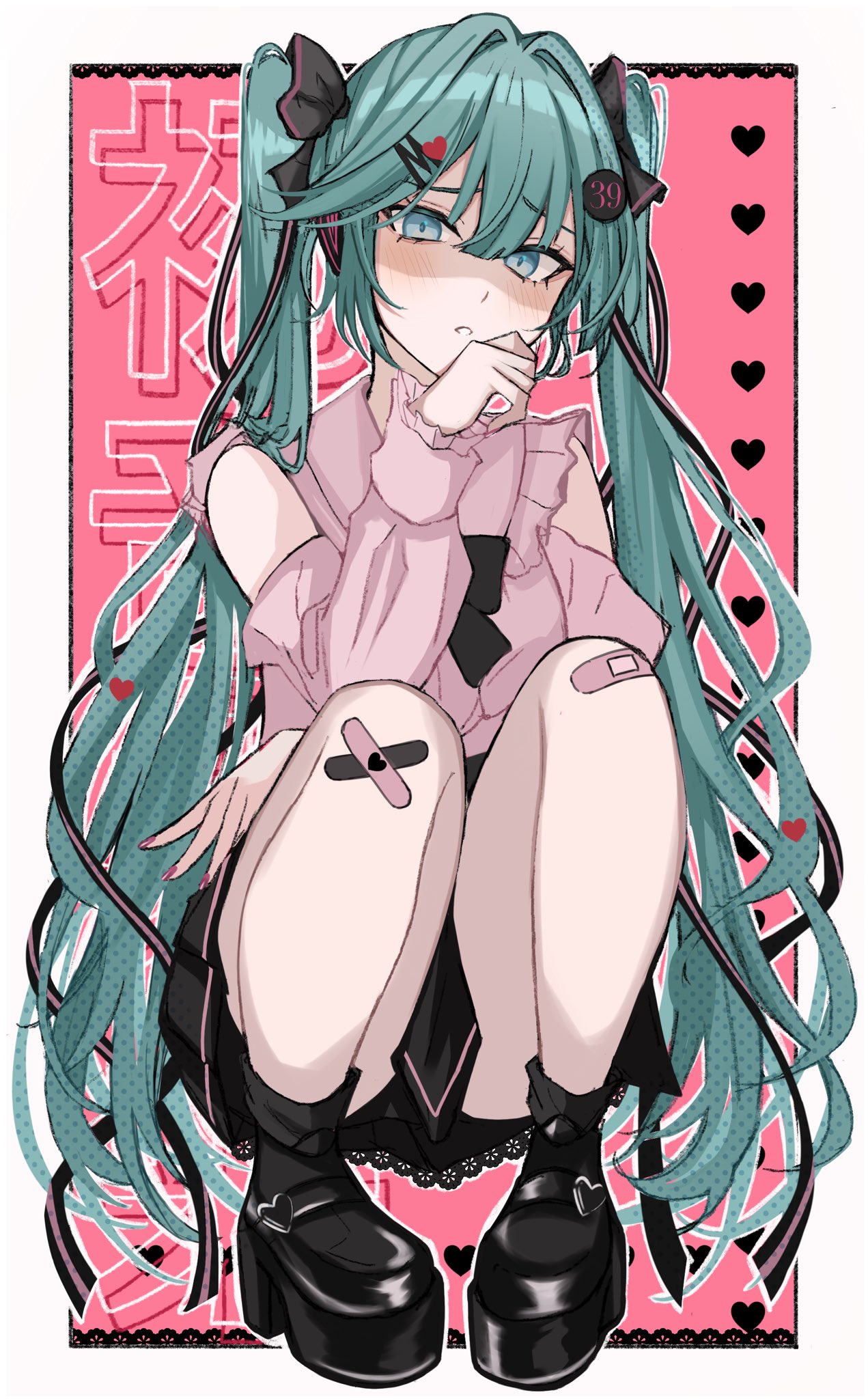 1girl alternate_costume aqua_eyes aqua_hair bandaid bandaid_on_knee bandaid_on_leg black_bow black_bowtie black_footwear black_skirt bow bowtie garan_(garan0502) hair_bow hair_ornament hairclip hatsune_miku highres jirai_kei looking_at_viewer pink_nails pink_shirt shirt skirt squatting twintails vocaloid