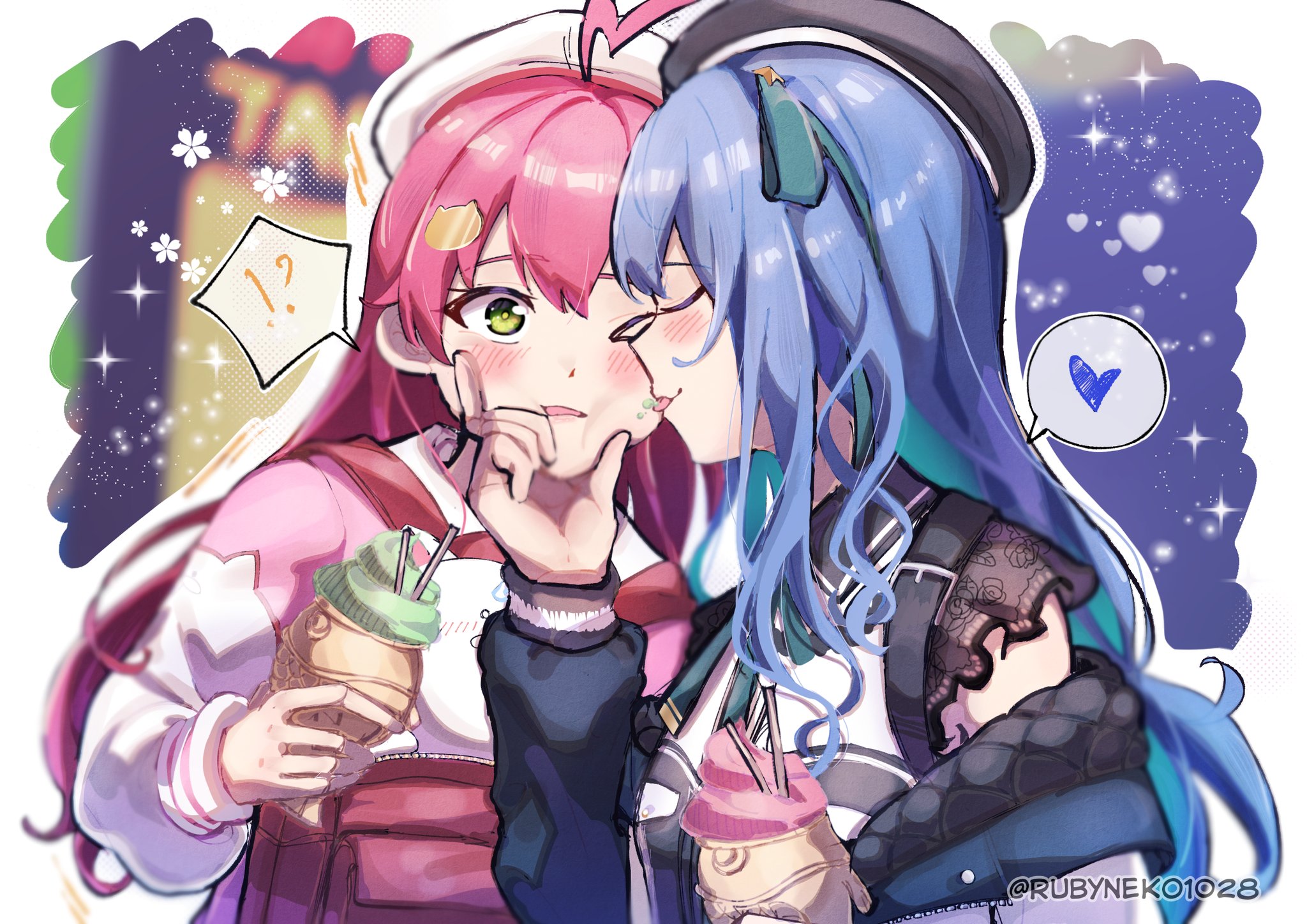 ! !? 2girls 35p_(sakura_miko) backpack bag beret black_dress blue_hair blush cat_hair_ornament dress grabbing_another's_chin green_eyes hair_ornament hair_wagging hand_on_another's_chin hat heart highres holding holding_bag holding_ice_cream_cone hololive hoshimachi_suisei hoshimachi_suisei_(casual) ice_cream_cone jacket letterman_jacket licking licking_another's_cheek licking_another's_face long_hair long_sleeves multiple_girls official_alternate_costume open_clothes open_jacket petals pink_hair pink_jacket puffy_cheeks quilted_jacket ruby_(rubyneko1028) sakura_miko sakura_miko_(school_uniform) sleeveless sleeveless_dress sparkle spoken_exclamation_mark spoken_heart spoken_interrobang star_(symbol) surprised tongue tongue_out virtual_youtuber wide-eyed yuri