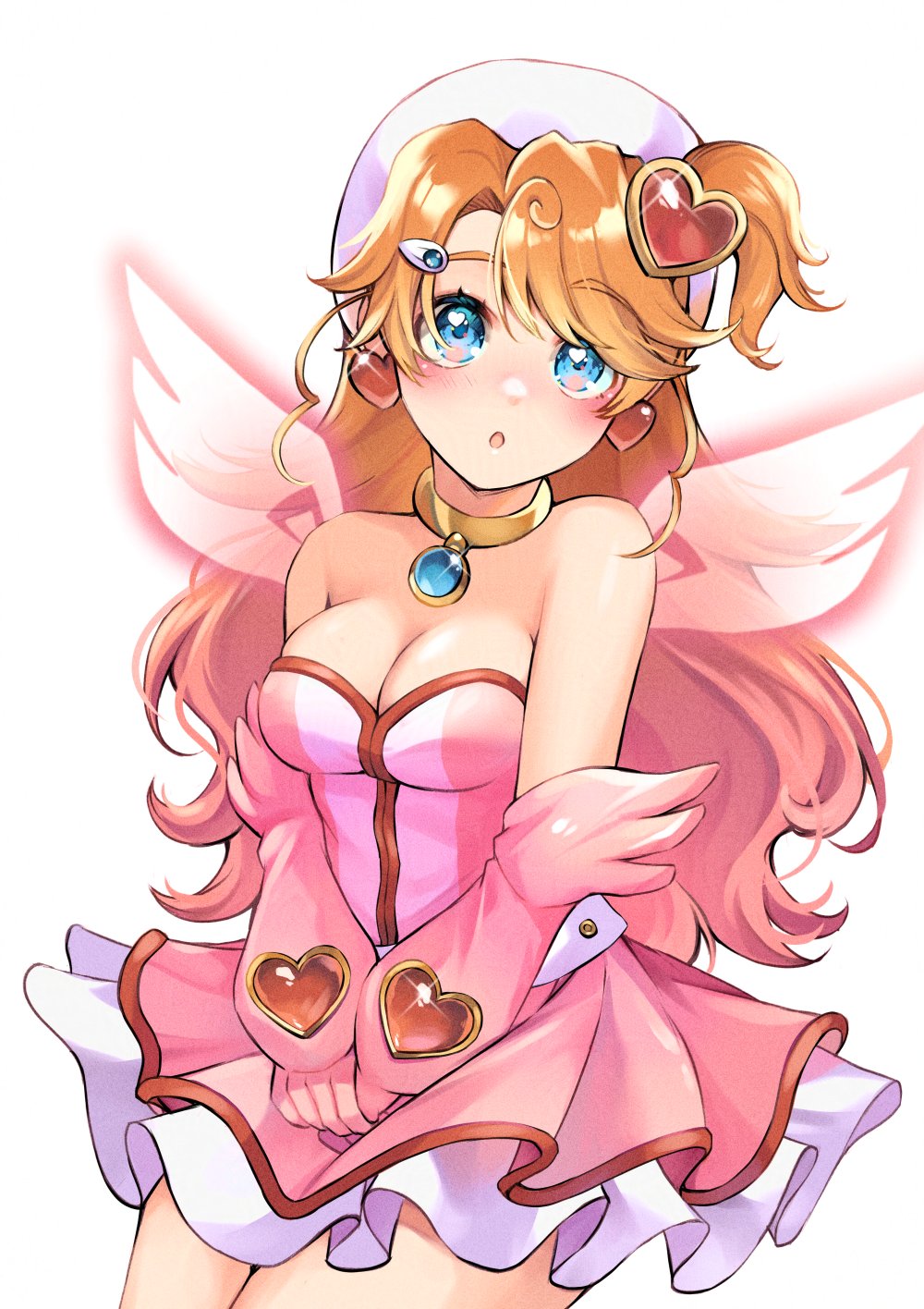 1girl bare_shoulders beret blue_eyes blush breasts cleavage commentary detached_sleeves dress earrings english_commentary frilled_dress frills gem glowing glowing_wings hair_ornament hairclip hat heart heart-shaped_pupils heart_earrings heart_hair_ornament highres indie_virtual_youtuber jewelry long_hair marikyuunn_(cyber_cupid)_(vtuber) medium_breasts mia_mikhail one_side_up open_mouth orange_hair pink_dress simple_background solo strapless strapless_dress symbol-shaped_pupils thighs very_long_hair virtual_youtuber white_background white_hat wings yellow_collar