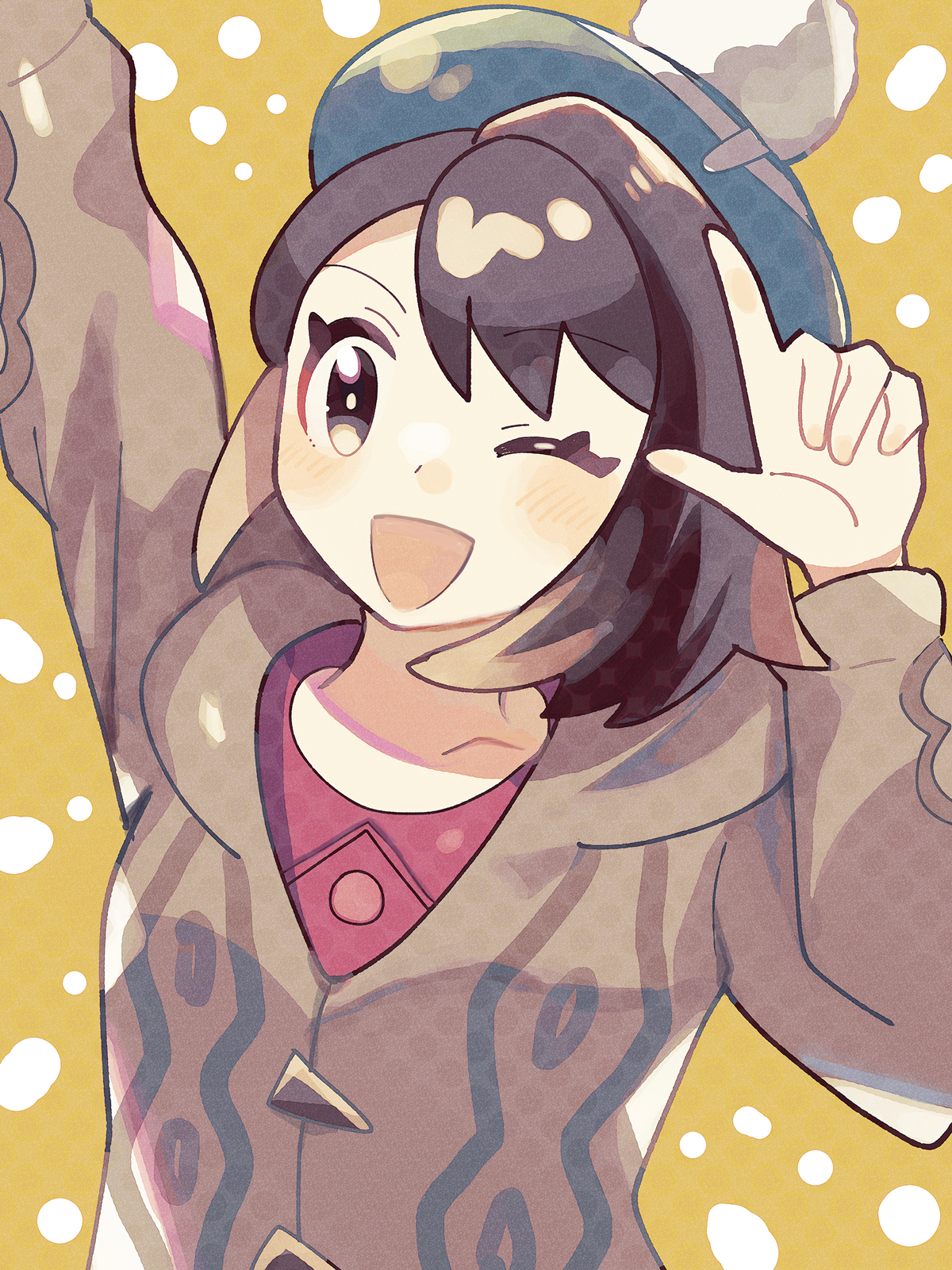 1girl ;d anidler91 arm_up black_eyes black_hair cardigan gloria_(pokemon) green_hat grey_cardigan hand_up hat highres hood hood_down hooded_cardigan long_sleeves nintendo one_eye_closed open_mouth pokemon pokemon_sword_and_shield short_hair smile solo tam_o'_shanter yellow_background