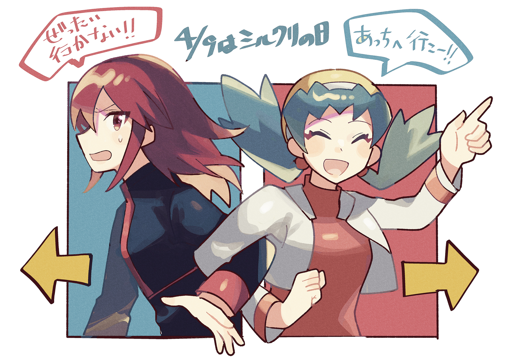 1boy 1girl :d ^_^ anidler91 arrow_(symbol) black_jacket blue_hair closed_eyes cropped_jacket hat highres jacket kris_(pokemon) locked_arms long_hair long_sleeves nintendo open_clothes open_jacket open_mouth pokemon pokemon_gold/silver/crystal red_eyes red_hair red_shirt red_trim shirt sideways_mouth silver_(pokemon) smile speech_bubble translation_request twintails white_jacket yellow_hat