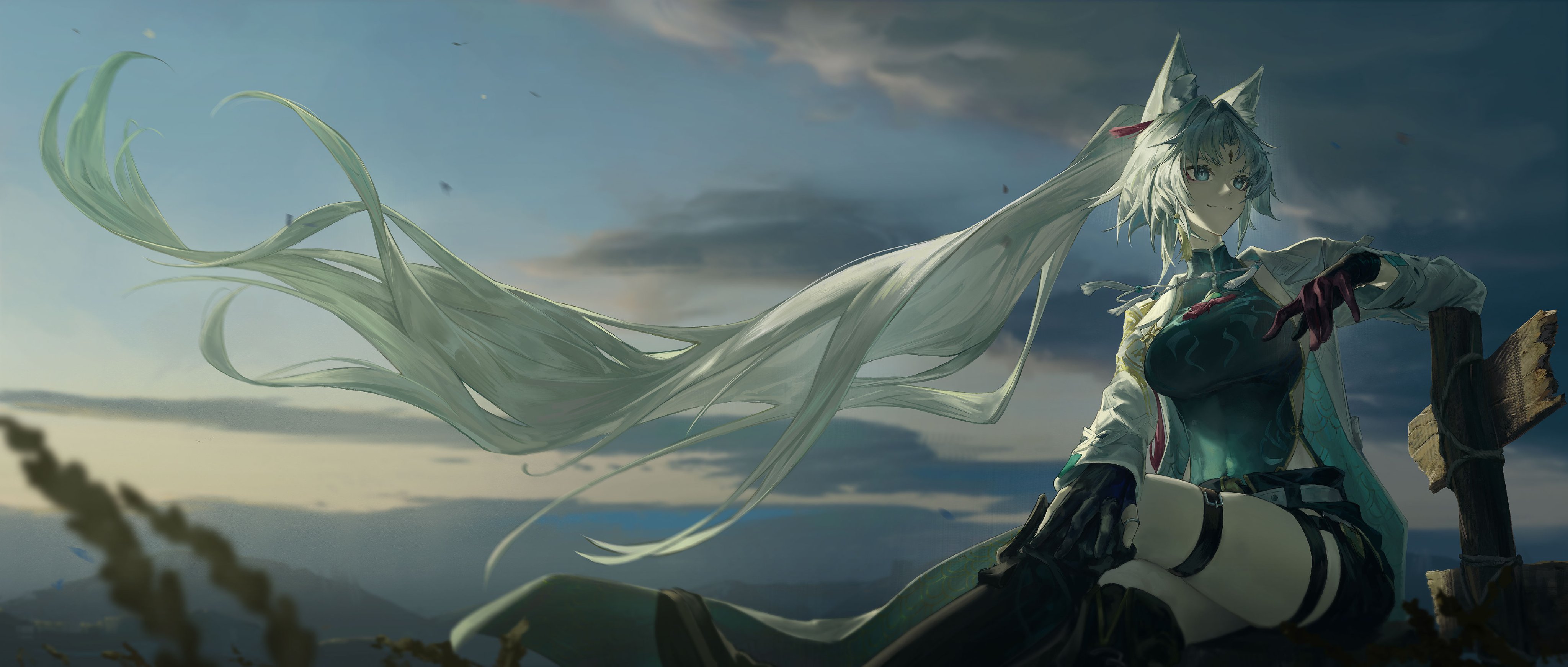 1girl absurdres animal_ear_fluff animal_ears aqua_coat belt black_boots black_gloves black_shorts blue_eyes blue_shirt blue_sky boots breasts chinese_clothes closed_mouth cloud cloudy_sky coat covered_navel earrings feixiao_(honkai:_star_rail) floating_hair forehead_jewel fox_ears fox_girl gloves gradient_sky grey_belt gyoukan_(jfxc) highres honkai:_star_rail honkai_(series) jewelry lapels large_breasts long_hair long_sleeves looking_to_the_side mandarin_collar mountain open_clothes open_coat outdoors parted_bangs ponytail shirt shorts single_earring sitting sky sleeveless sleeveless_shirt solo tassel tassel_earrings thigh_strap two-sided_coat two-sided_fabric very_long_hair white_coat white_hair yellow_sky