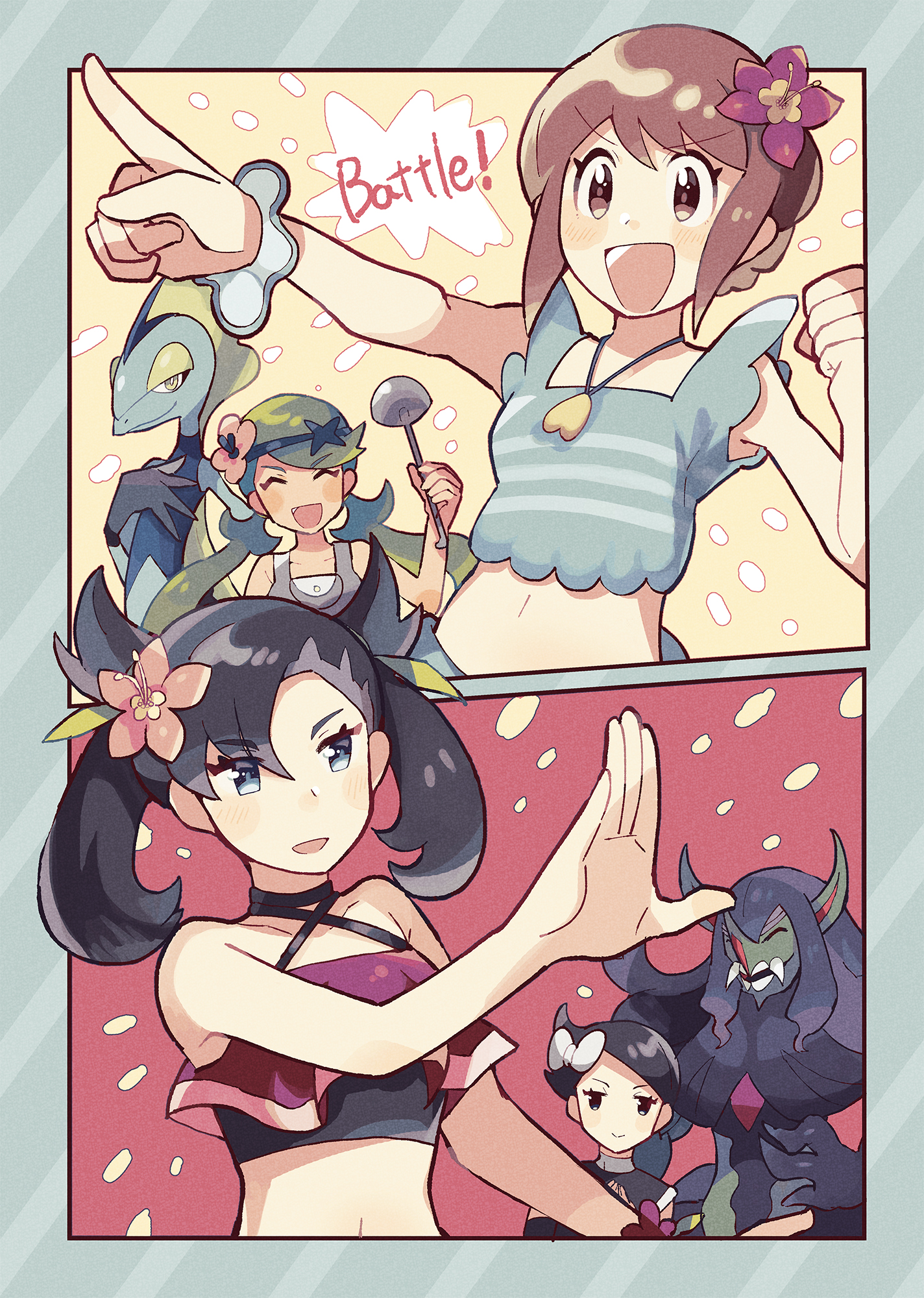 4girls :d ^_^ anidler91 asymmetrical_bangs bare_arms bare_shoulders bikini black_choker black_hair blue_bikini blue_eyes bow brown_eyes brown_hair choker clenched_hand closed_eyes commentary_request criss-cross_halter flower gen_8_pokemon gloria_(pokemon) gloria_(summer_2021)_(pokemon) green_hair grimmsnarl hair_bow hair_flower hair_ornament halterneck highres holding holding_ladle index_finger_raised inteleon jewelry ladle long_hair mallow_(pokemon) marley_(pokemon) marnie_(pokemon) marnie_(summer_2021)_(pokemon) multiple_girls navel necklace nintendo open_mouth outstretched_arm pink_flower pokemon pokemon_(creature) pokemon_diamond/pearl/platinum pokemon_masters_ex pokemon_sun_and_moon purple_flower short_hair smile striped_bikini striped_clothes swimsuit twintails v-shaped_eyebrows white_bow