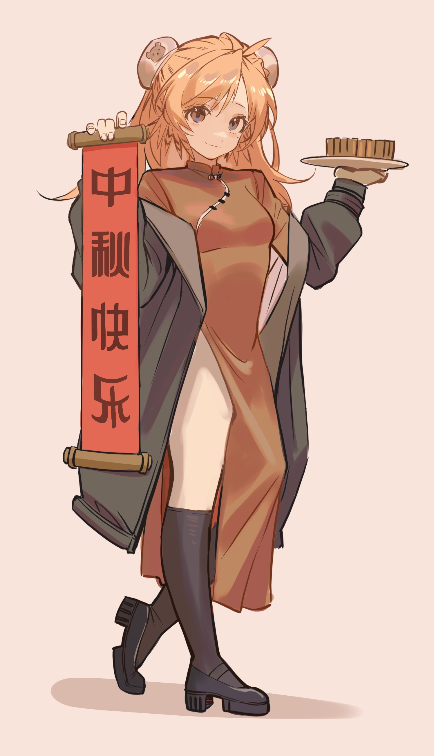 1girl absurdres alternate_costume arknights black_coat black_shoes black_socks blue_eyes breasts bun_cover china_dress chinese_clothes chinese_commentary chinese_text coat commentary double_bun dress full_body hair_bun highres holding holding_plate holding_scroll kneehighs long_hair looking_at_viewer mary_janes mooncake off_shoulder open_clothes open_coat orange_hair petite pinecone_(arknights) pink_background plantar_flexion plate red_dress scroll shadow shoes simple_background simplified_chinese_text small_breasts smile socks solo standing tiptoes wangmou_zilaojuan