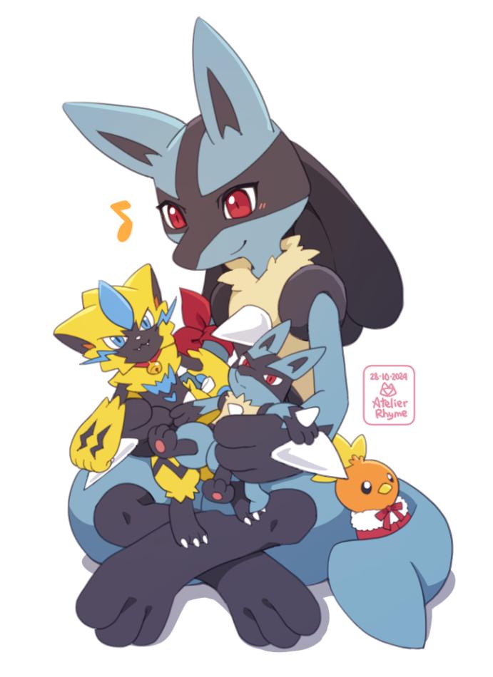 1other atelier_rhyme black_hair blush closed_mouth dated furry gen_3_pokemon gen_4_pokemon gen_7_pokemon holding legendary_pokemon looking_down lucario musical_note mythical_pokemon nintendo pokemon pokemon_(creature) red_eyes shadow simple_background sitting smile spikes stuffed_animal stuffed_toy tail torchic white_background zeraora