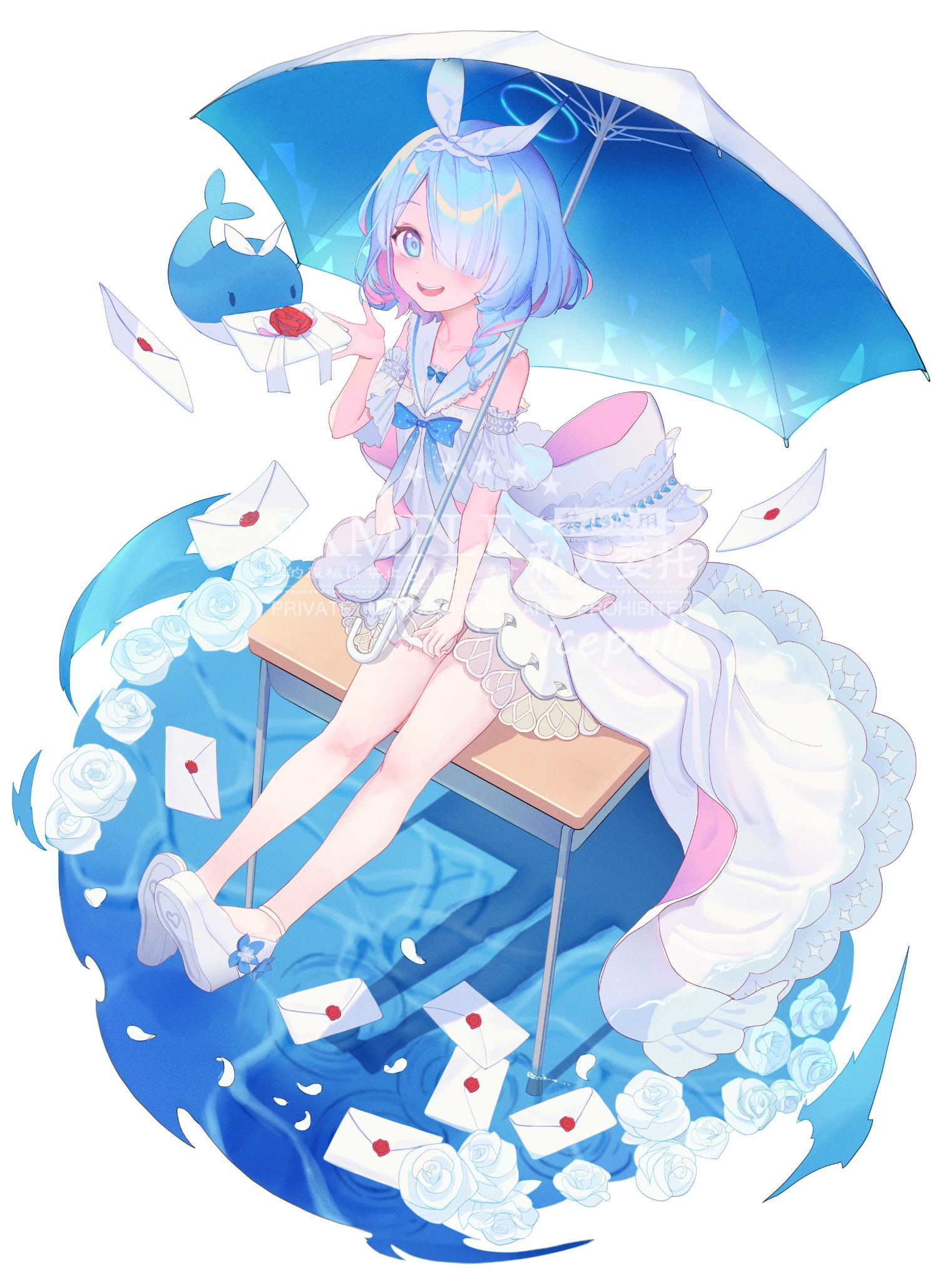 1girl alternate_costume arona_(blue_archive) bare_legs blue_archive blue_eyes blue_hair colored_inner_hair commentary desk dress flower hair_over_one_eye hand_up highres ice_(icepuli) letter looking_at_viewer looking_up multicolored_hair on_desk pink_hair rose sample_watermark simple_background sitting smile solo untranslatable_commentary umbrella watermark whale white_background white_dress white_flower white_footwear white_rose