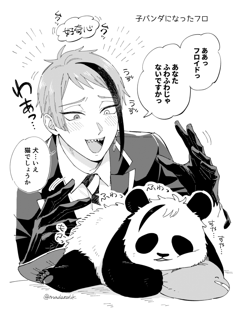 1boy animal animalization commentary_request cub floyd_leech gloves greyscale happy_aura heterochromia jade_leech madara6k male_focus monochrome night_raven_college_school_uniform panda school_uniform sharp_teeth short_hair solo teeth translation_request twisted_wonderland