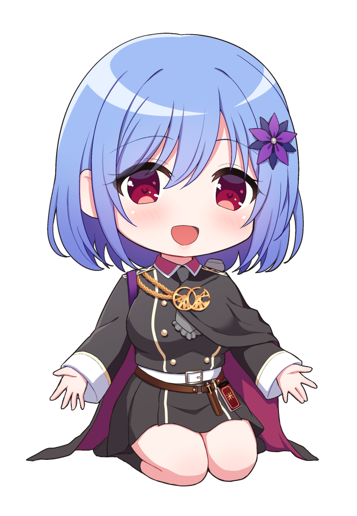 1girl :d belt belt_buckle black_cape black_jacket black_skirt black_socks blue_hair buckle cape chibi flower full_body hair_between_eyes hair_flower hair_ornament houkiboshi_(prima_doll) jacket long_sleeves looking_at_viewer nakamura_hinato open_mouth pleated_skirt prima_doll_(anime) purple_flower red_eyes seiza side_cape simple_background sitting skirt sleeves_past_wrists smile socks solo white_background white_belt