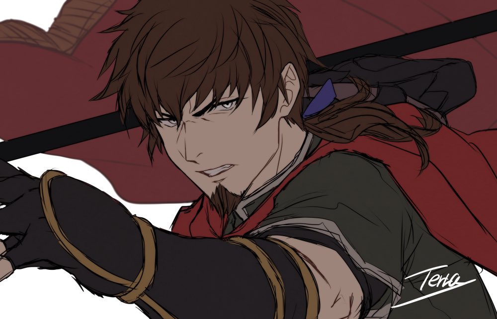 1boy blue_ribbon brown_hair cape facial_hair fate/grand_order fate_(series) gauntlets goatee grimace hector_(fate) holding holding_polearm holding_weapon looking_at_viewer male_focus mature_male polearm ponytail red_cape ribbon signature sketch solo terra_ekm tunic weapon
