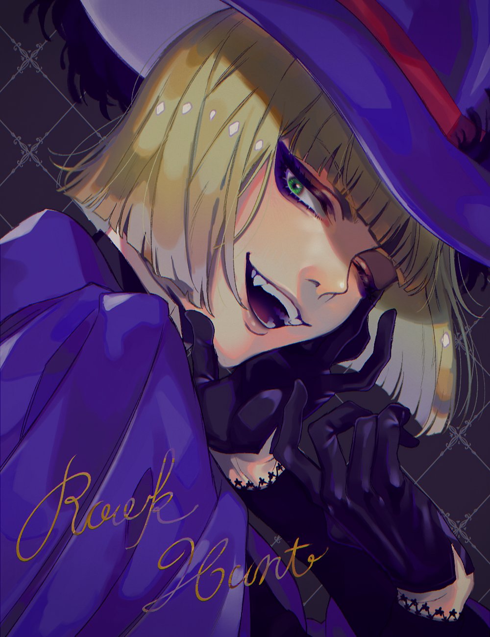 1boy black_background black_gloves blonde_hair gloves green_eyes hat highres kajino looking_at_viewer looking_back male_focus one_eye_closed rook_hunt short_hair solo twisted_wonderland upper_body