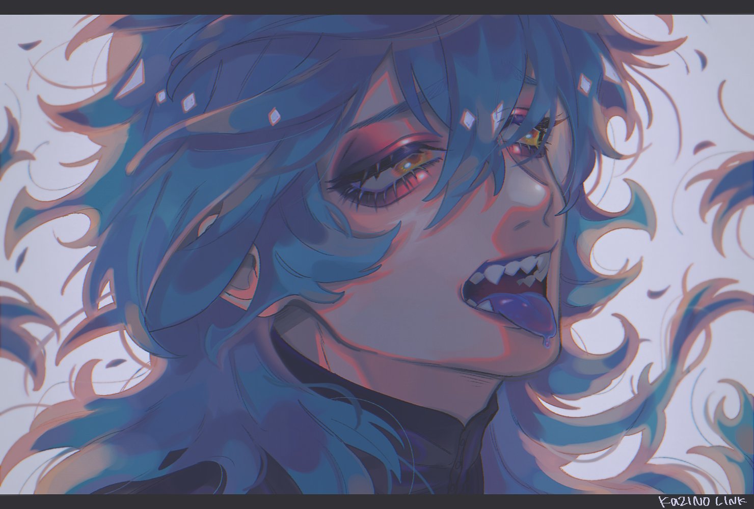 1boy blue_hair colored_tongue commentary_request fiery_hair idia_shroud kajino letterboxed long_hair looking_to_the_side male_focus portrait purple_tongue sharp_teeth solo teeth tongue tongue_out twisted_wonderland yellow_eyes