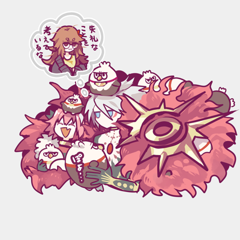 1girl 2boys animal astolfo_(fate) astolfo_(rider)_(fate) blue_eyes brown_hair fang fate/grand_order fate_(series) glasses hair_between_eyes happy hiko_(lg612) hippogriff_(fate) holding holding_animal jinako_carigiri jitome karna_(fate) long_hair lowres multiple_boys no_nose pink_hair short_hair skin_fang translation_request white_hair